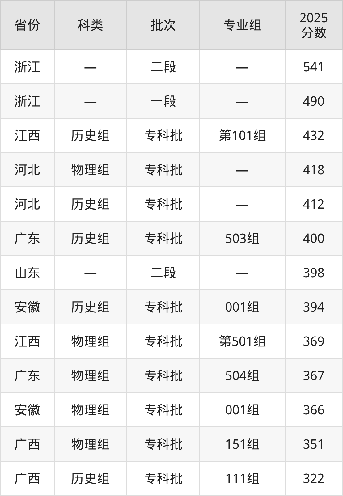 而浙江地区考生的分数门槛最高,2025年淮北职业技术学院在浙江招生最低分为541分,考生至少要超二段线273分才有可能被录取。