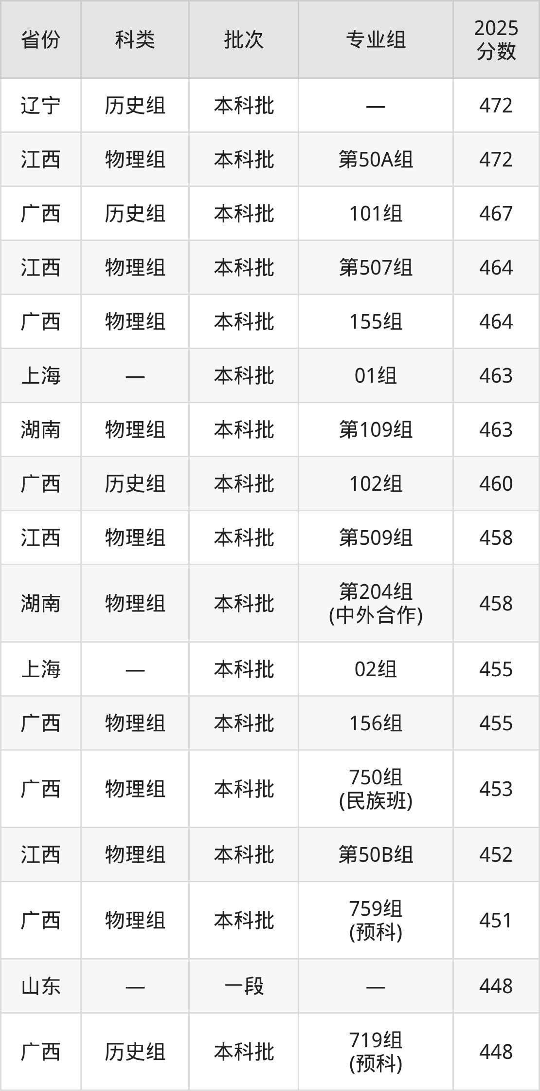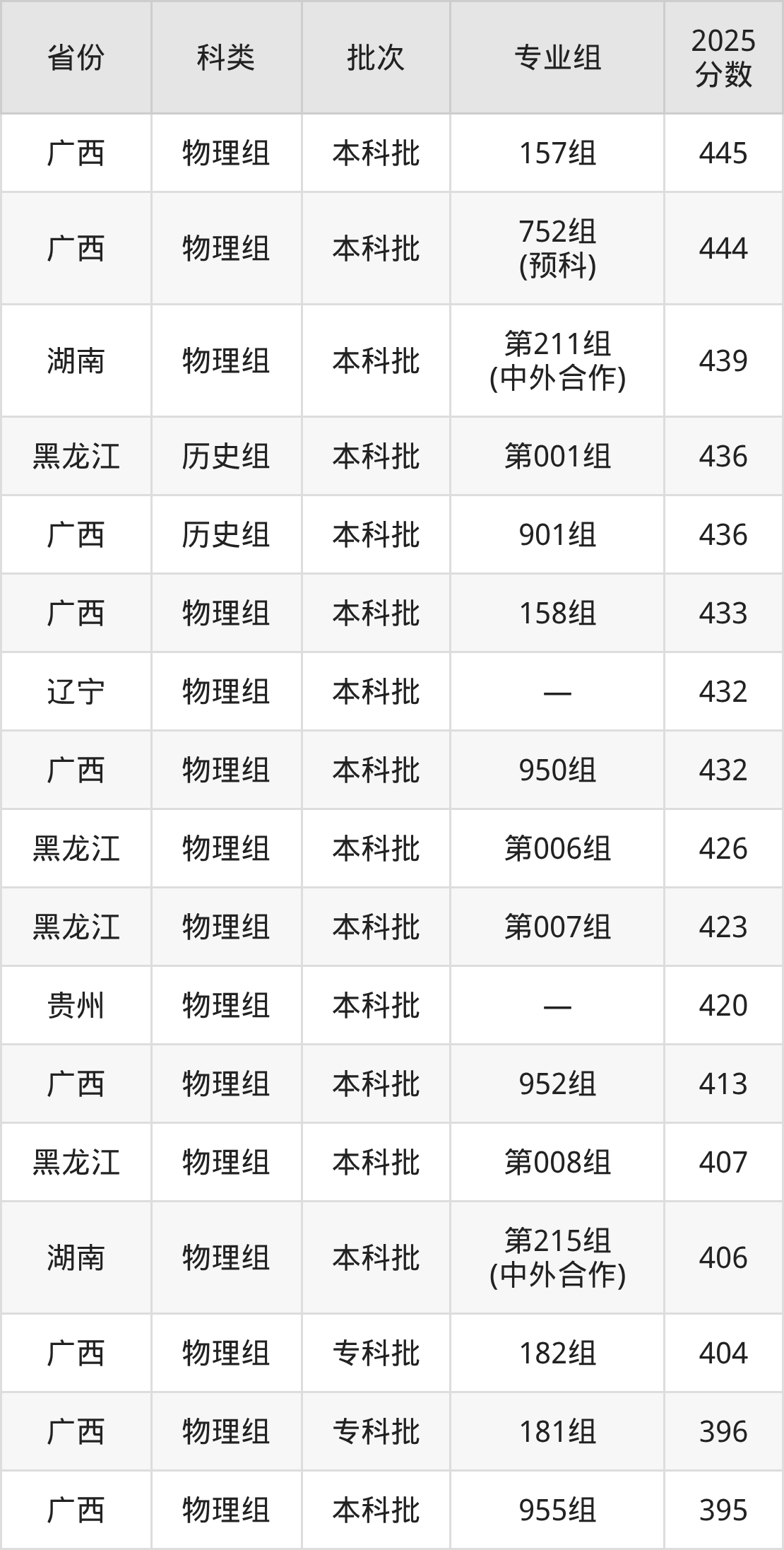 2025年桂林医科大学在全国普通批次招生的录取分数范围位于370~579分之间,其中壮族自治区内分数范围为370分~559分,物理组最低分专业组为“951组”,考生370分即可报考,历史组最低分专业组为“901组”,考生436分即可报考。