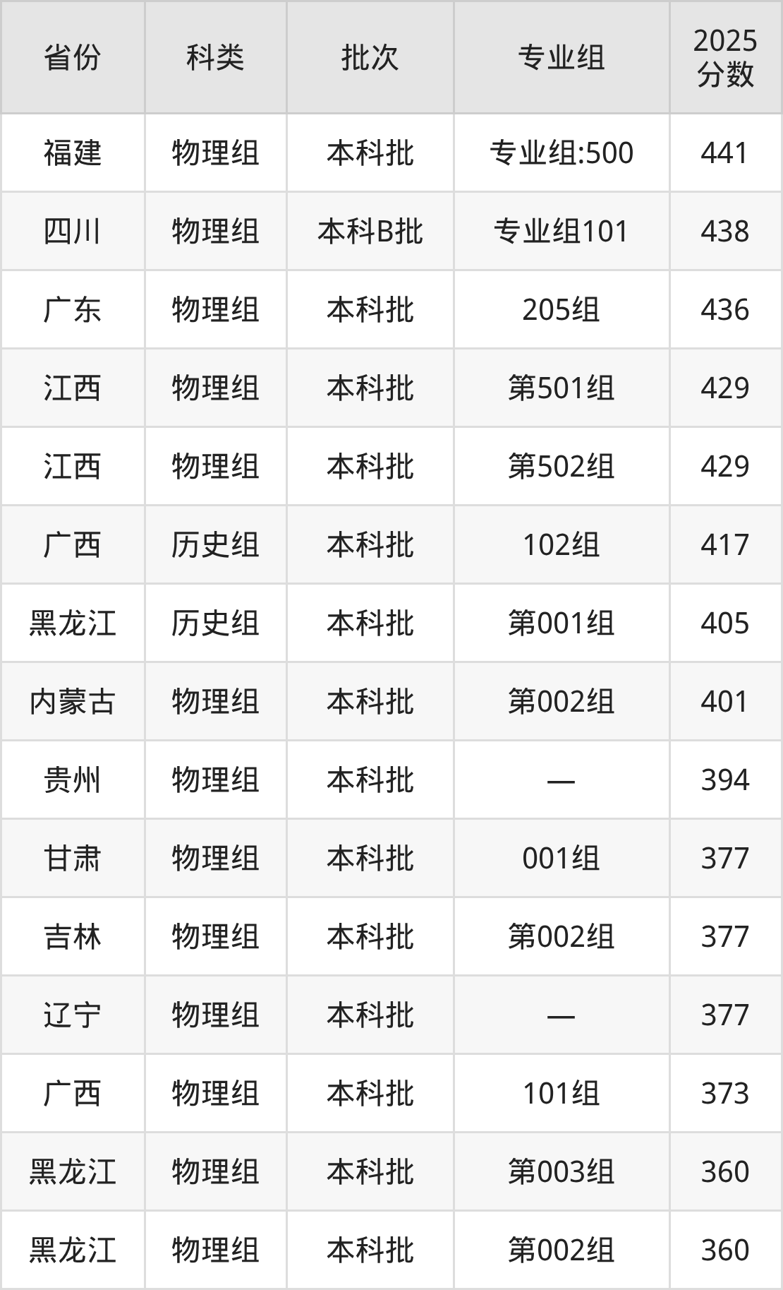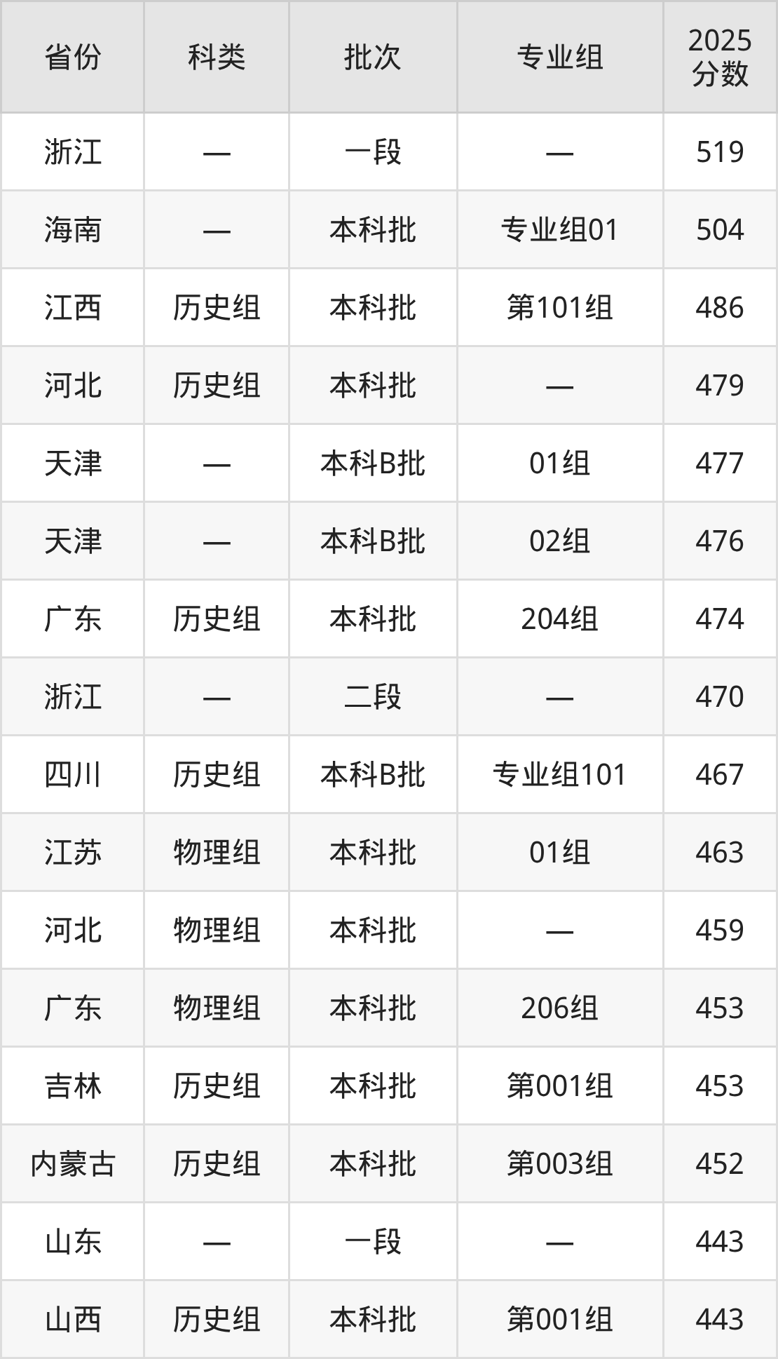 2025年黑龙江工商学院在全国普通批次招生的录取分数范围位于360~519分之间,其中省内分数范围为360分~405分,历史组最低分专业组为“第001组”,考生405分即可报考,物理组最低分专业组为“第003组”,考生360分即可报考。