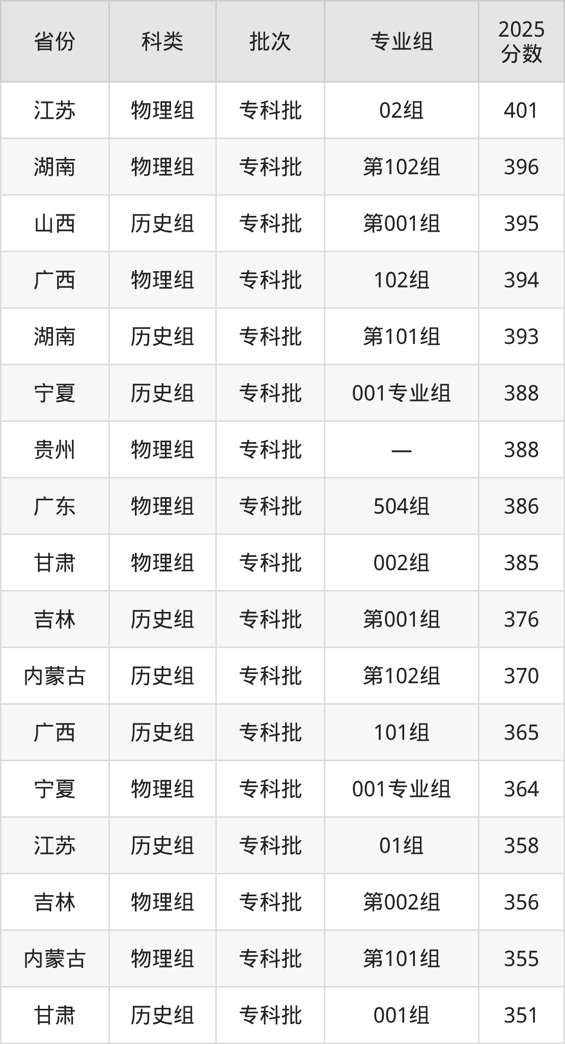 2025年江苏电子信息职业学院在全国普通批次招生的录取分数范围位于351~473分之间,其中省内分数范围为358分~473分,物理组最低分专业组为“02组”,考生401分即可报考,历史组最低分专业组为“01组”,考生358分即可报考。