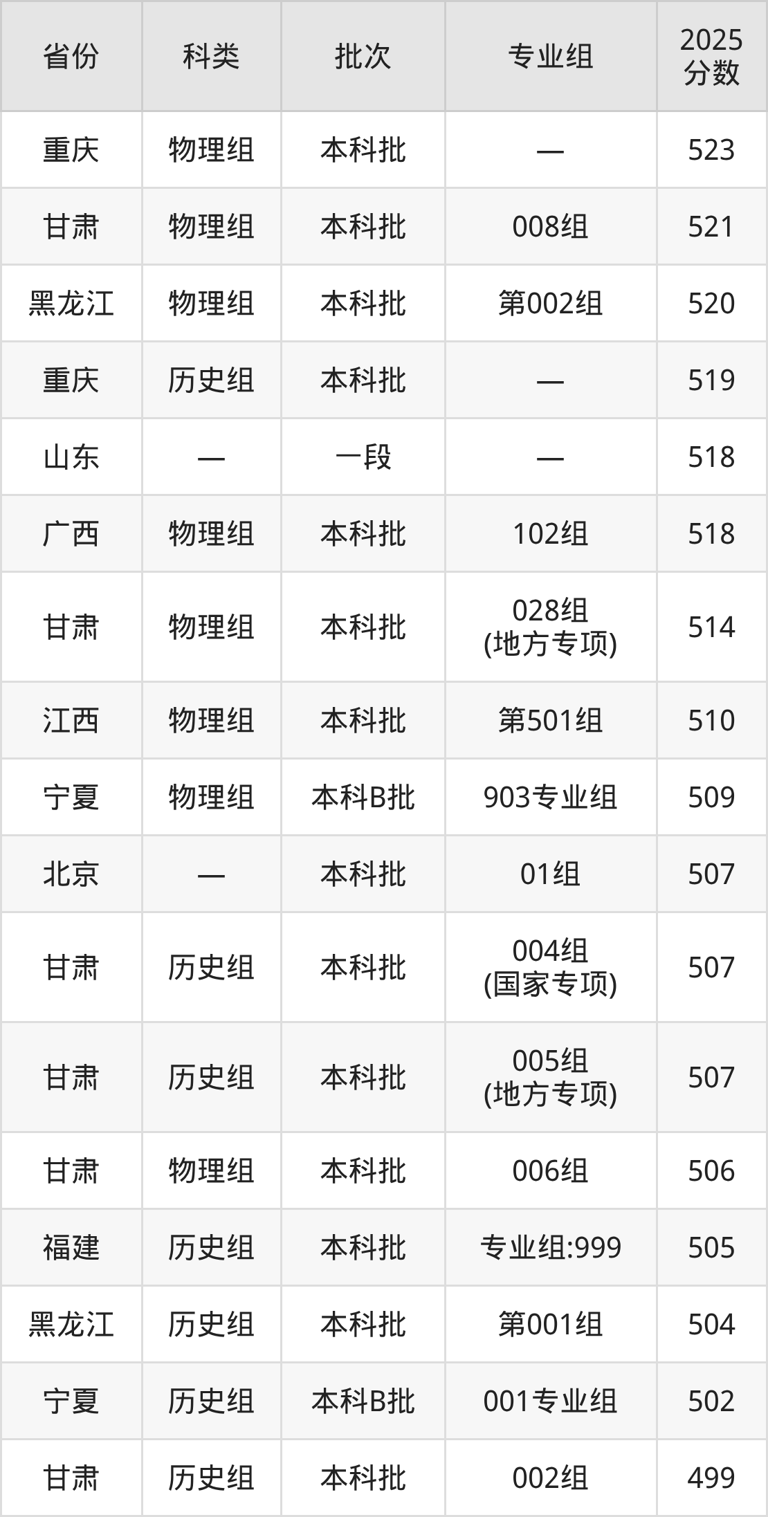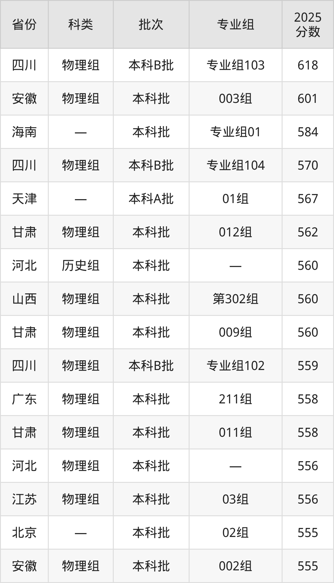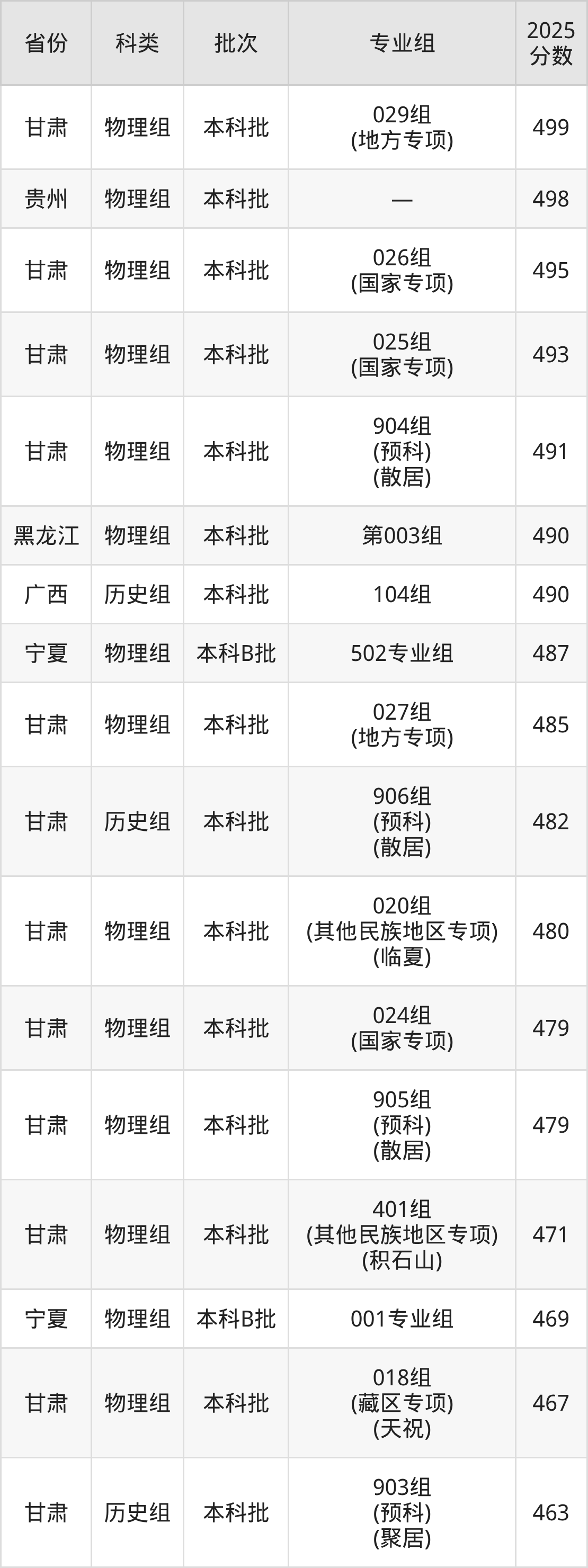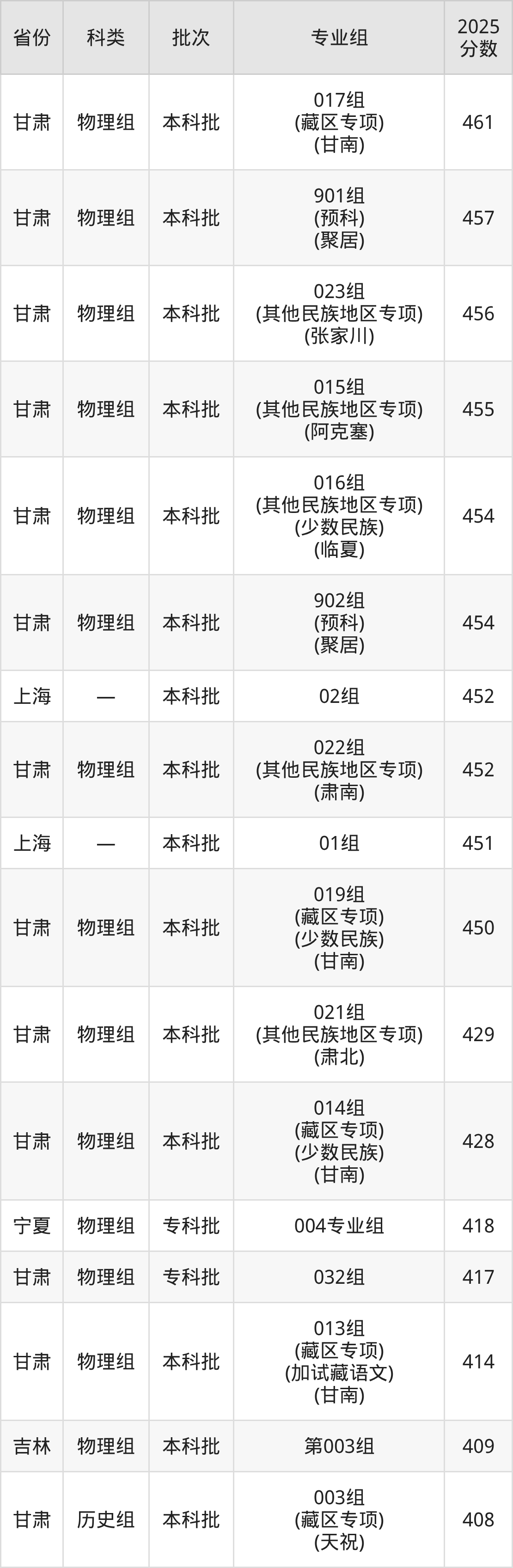 2025年兰州交通大学在全国普通批次招生的录取分数范围位于408~618分之间,其中省内分数范围为408分~562分,历史组最低分专业组为“003组(藏区专项)(天祝)”,考生408分即可报考,物理组最低分专业组为“013组(藏区专项)(加试藏语文)(甘南)”,考生414分即可报考。