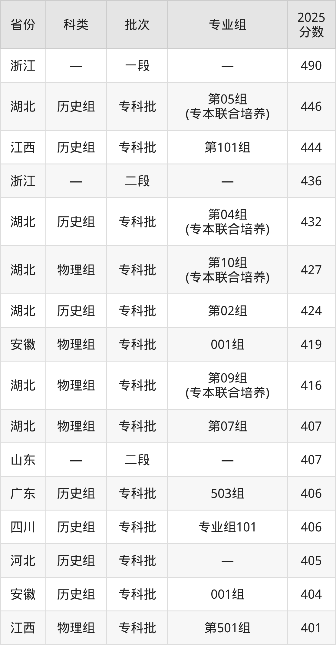 而浙江地区考生的分数门槛最高,2025年湖北生物科技职业学院在浙江招生最低分为490分,考生至少要超一段线0分才有可能被录取。