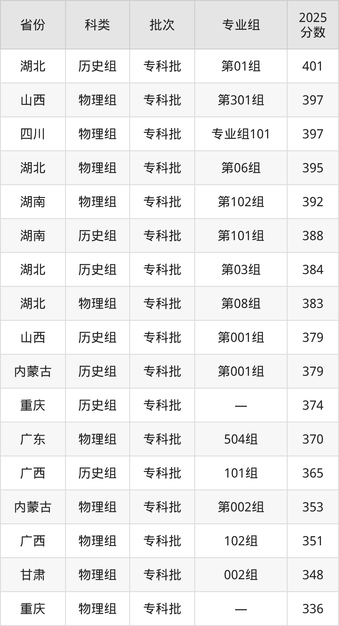 下面是湖北生物科技职业学院2025年在全国各省的录取分数线一览表,供参考: