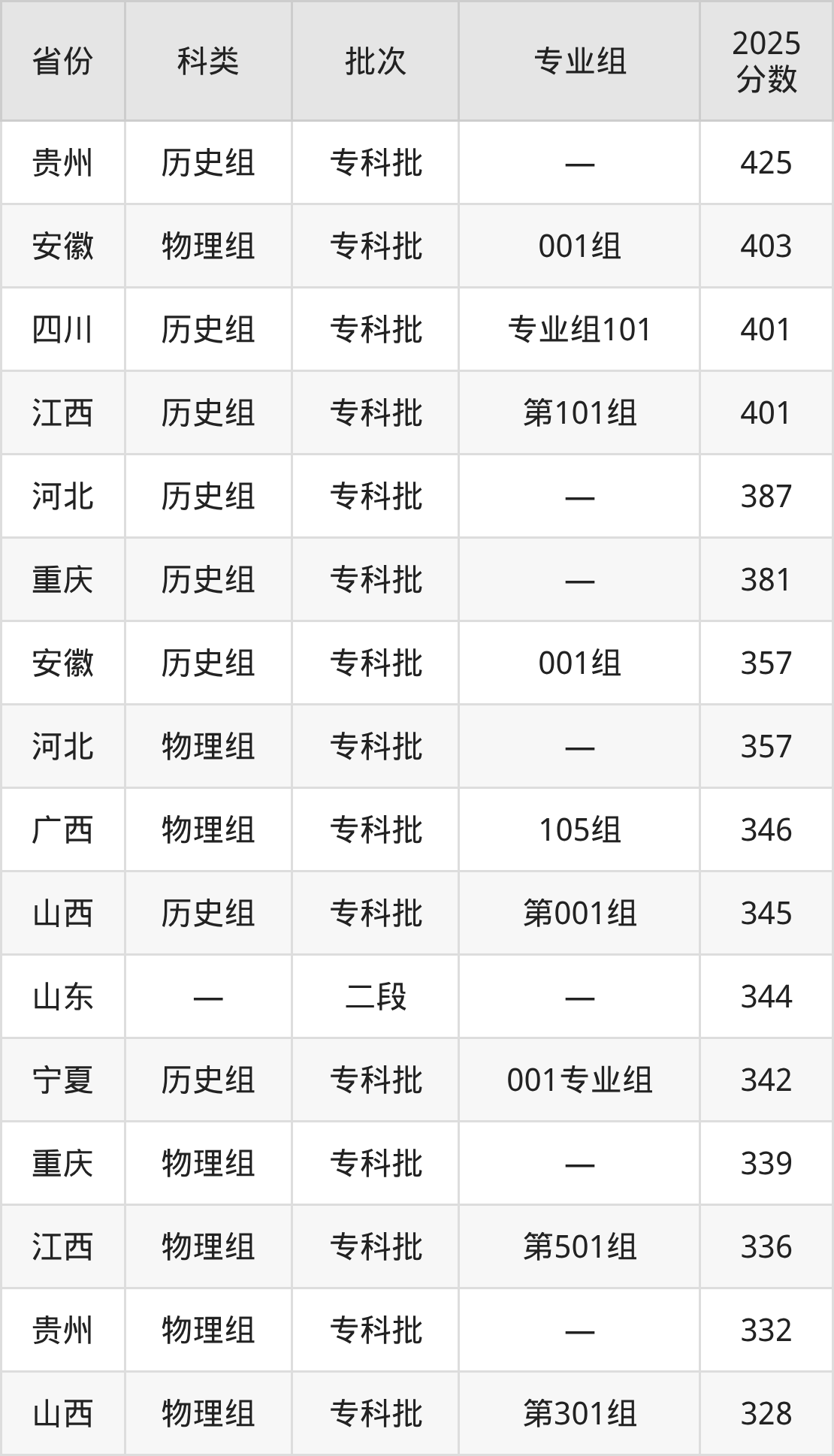 而贵州地区历史组考生的分数门槛最高,2025年安康职业技术学院在贵州招生最低分为425分,考生至少要超专科线245分才有可能被录取。