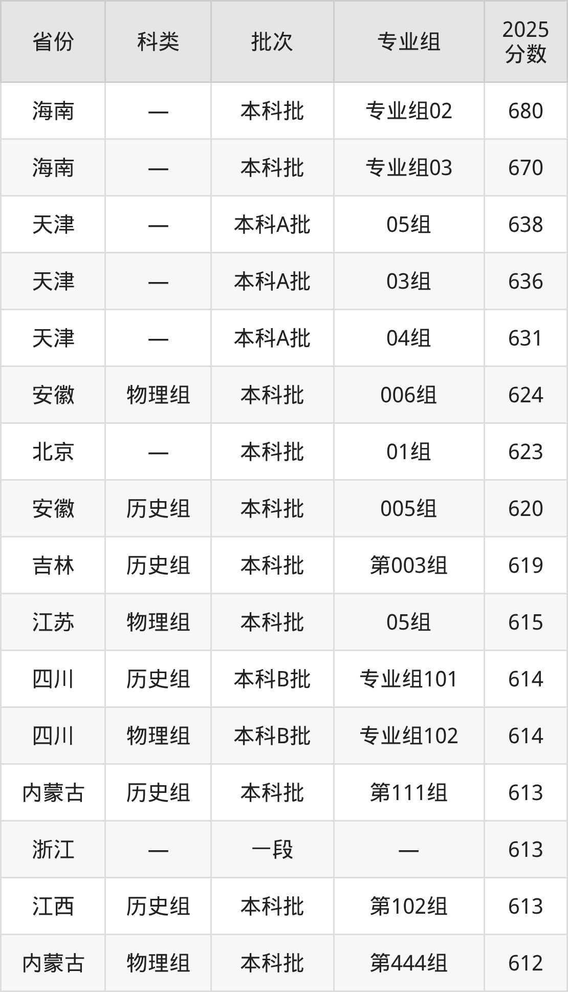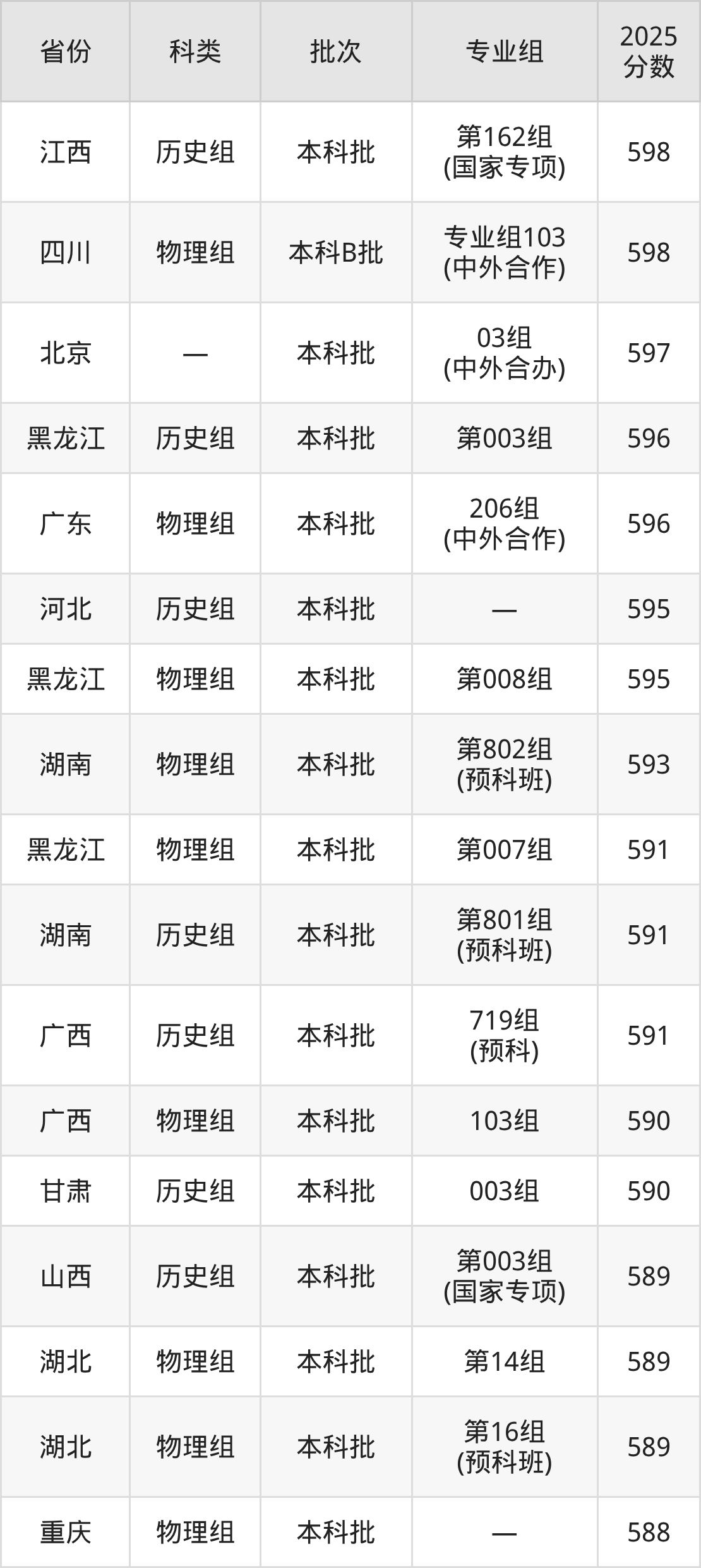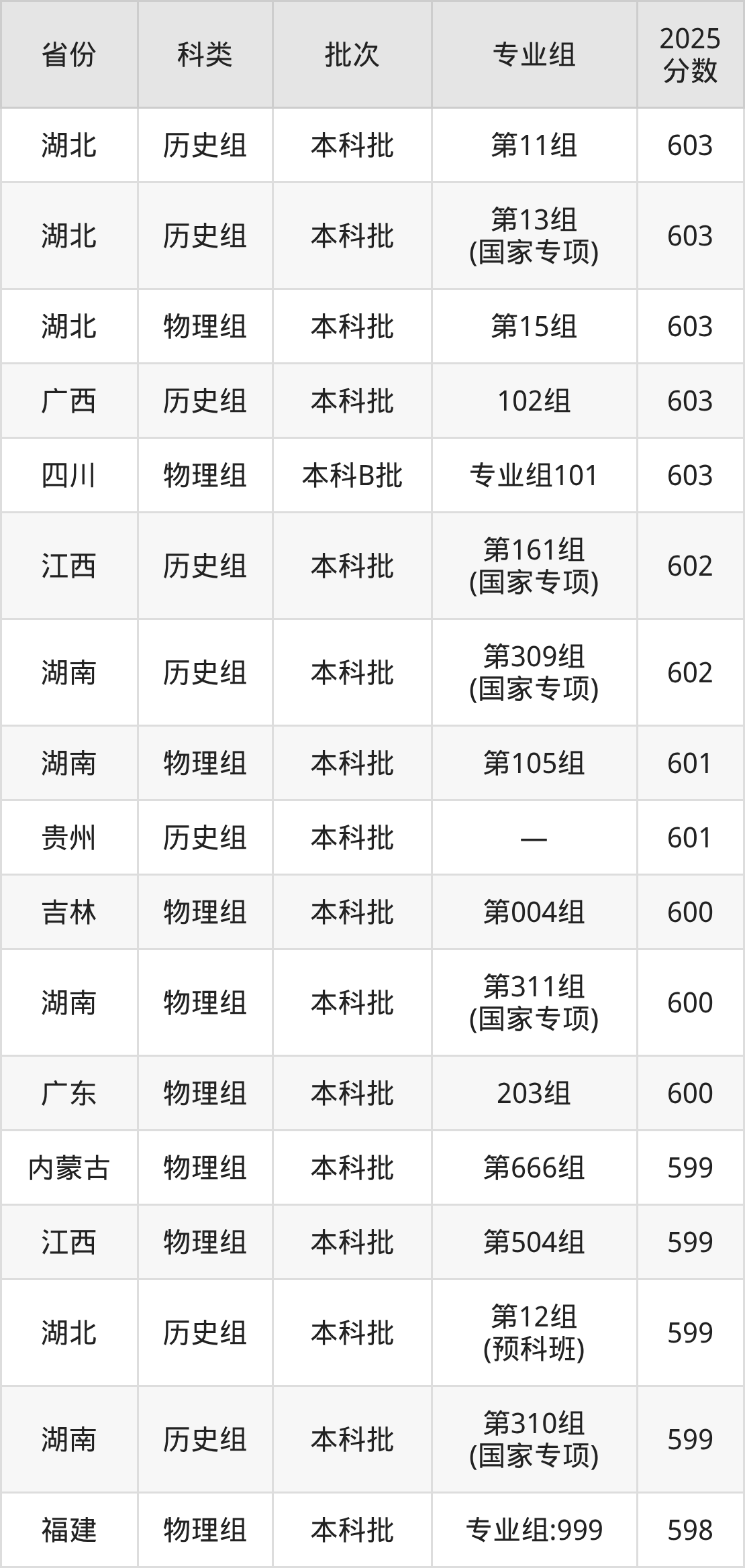2025年中南财经政法大学在全国普通批次招生的录取分数范围位于468~680分之间,其中省内分数范围为586分~603分,历史组最低分专业组为“第12组(预科班)”,考生599分即可报考,物理组最低分专业组为“第17组(国家专项)”,考生586分即可报考。