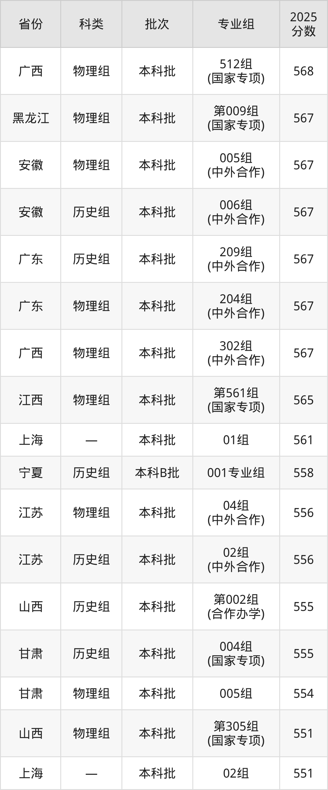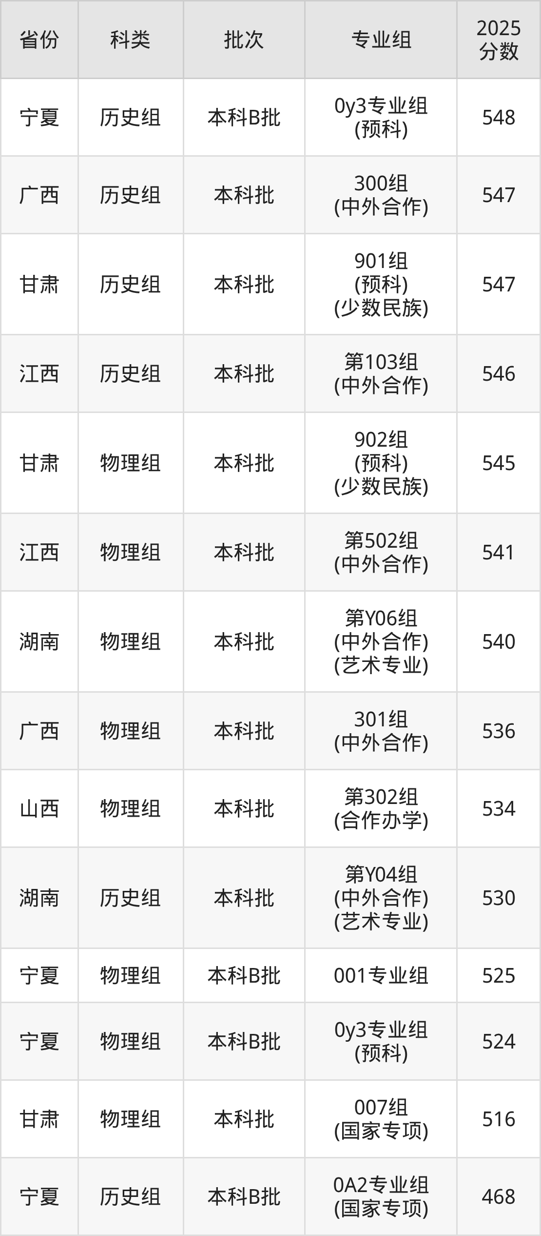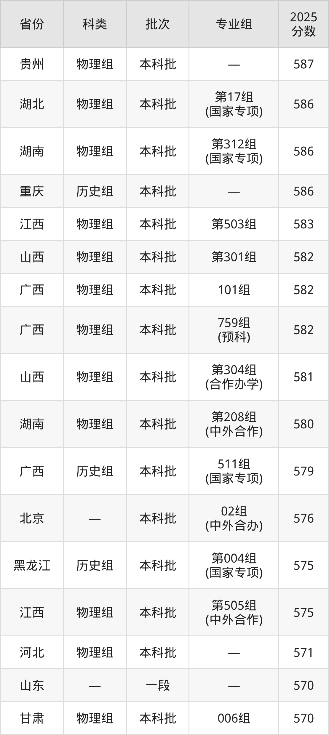 2025年中南财经政法大学在全国普通批次招生的录取分数范围位于468~680分之间,其中省内分数范围为586分~603分,历史组最低分专业组为“第12组(预科班)”,考生599分即可报考,物理组最低分专业组为“第17组(国家专项)”,考生586分即可报考。