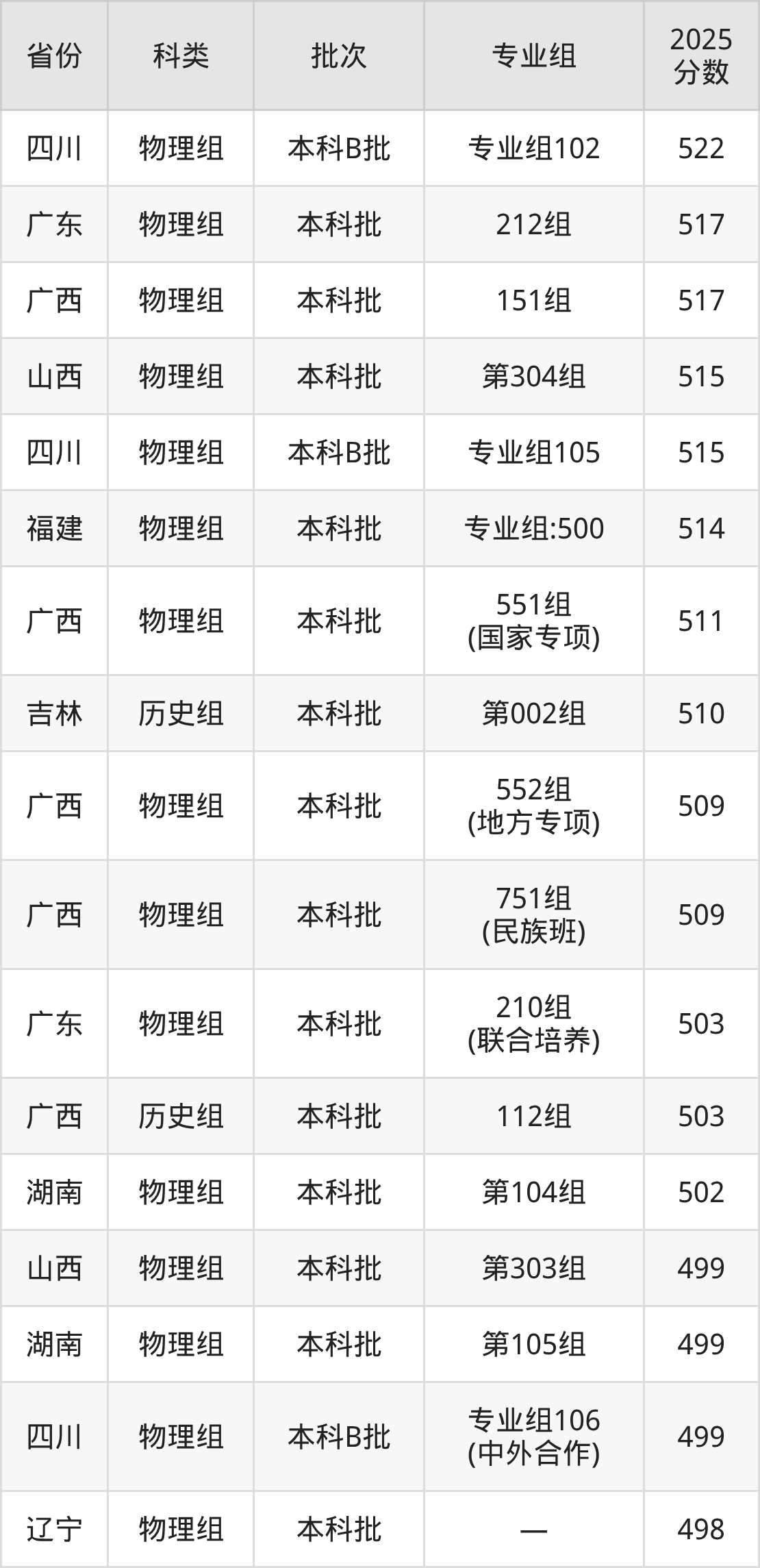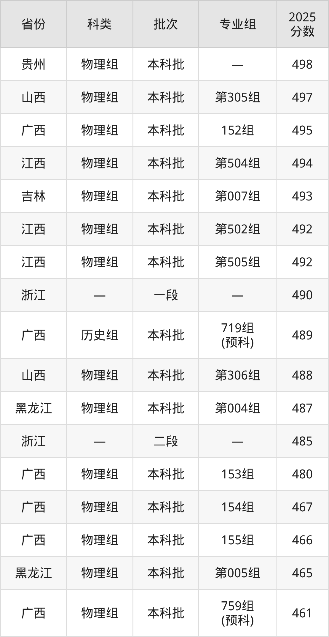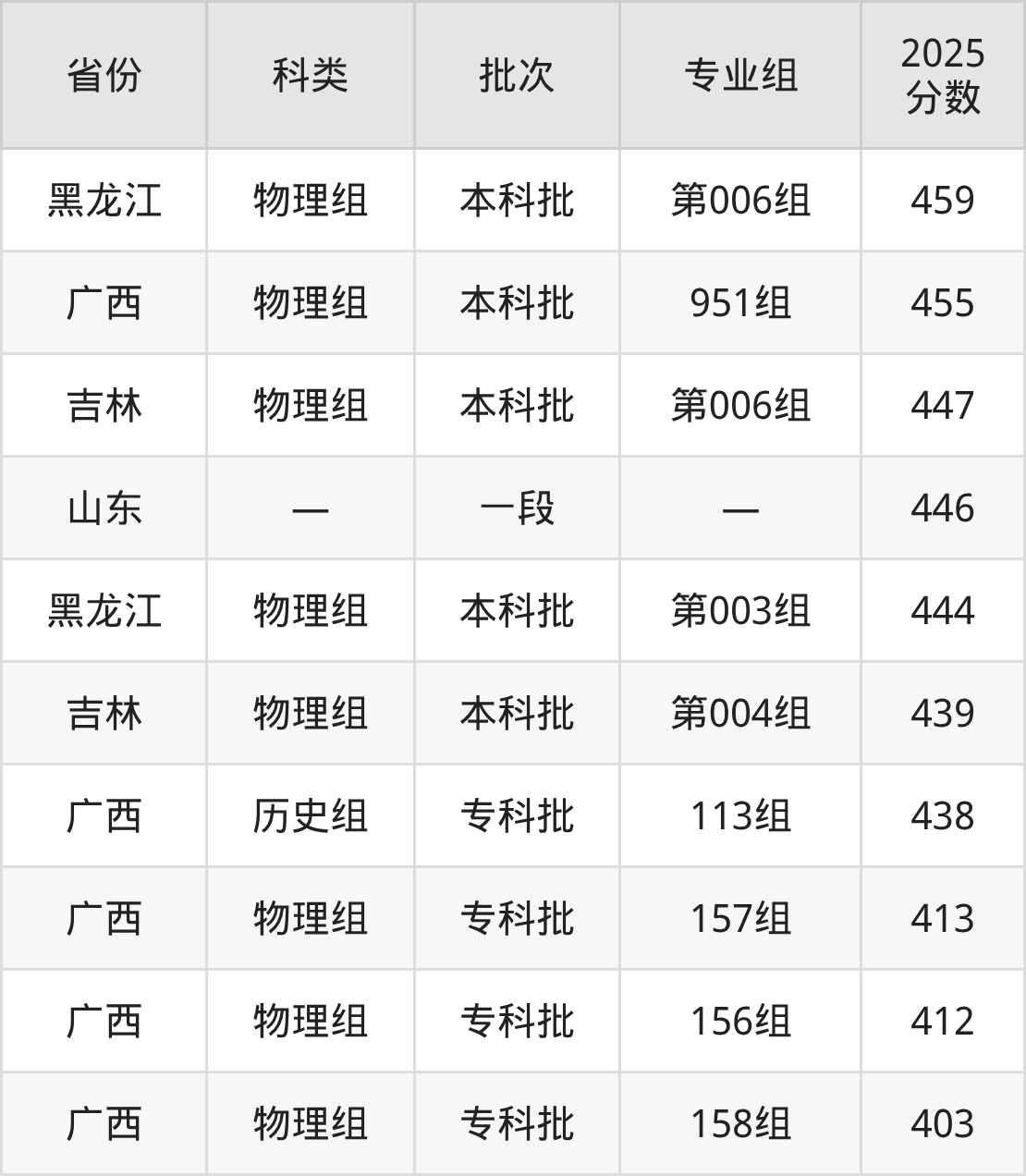 2025年广西中医药大学在全国普通批次招生的录取分数范围位于403~638分之间,其中壮族自治区内分数范围为403分~545分,物理组最低分专业组为“158组”,考生403分即可报考,历史组最低分专业组为“113组”,考生438分即可报考。