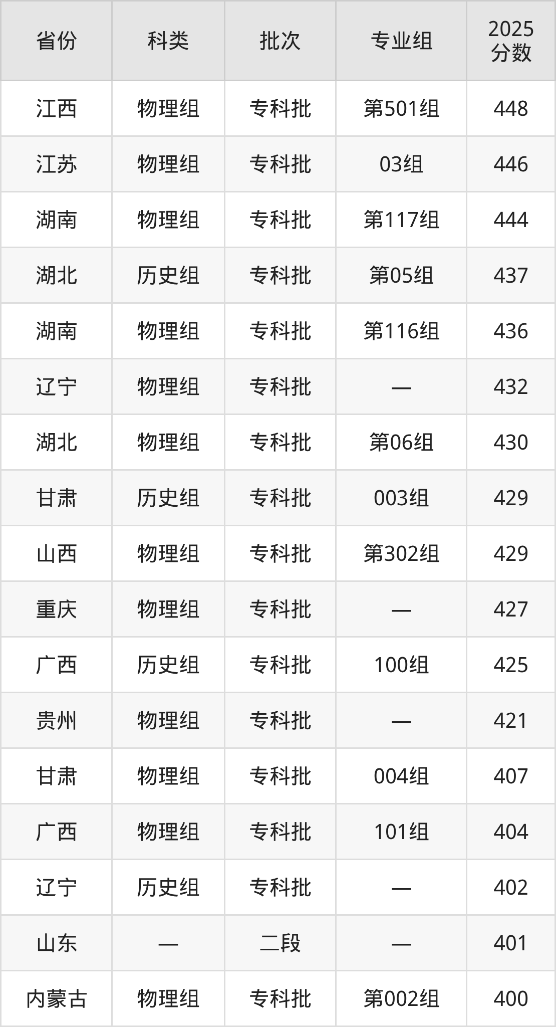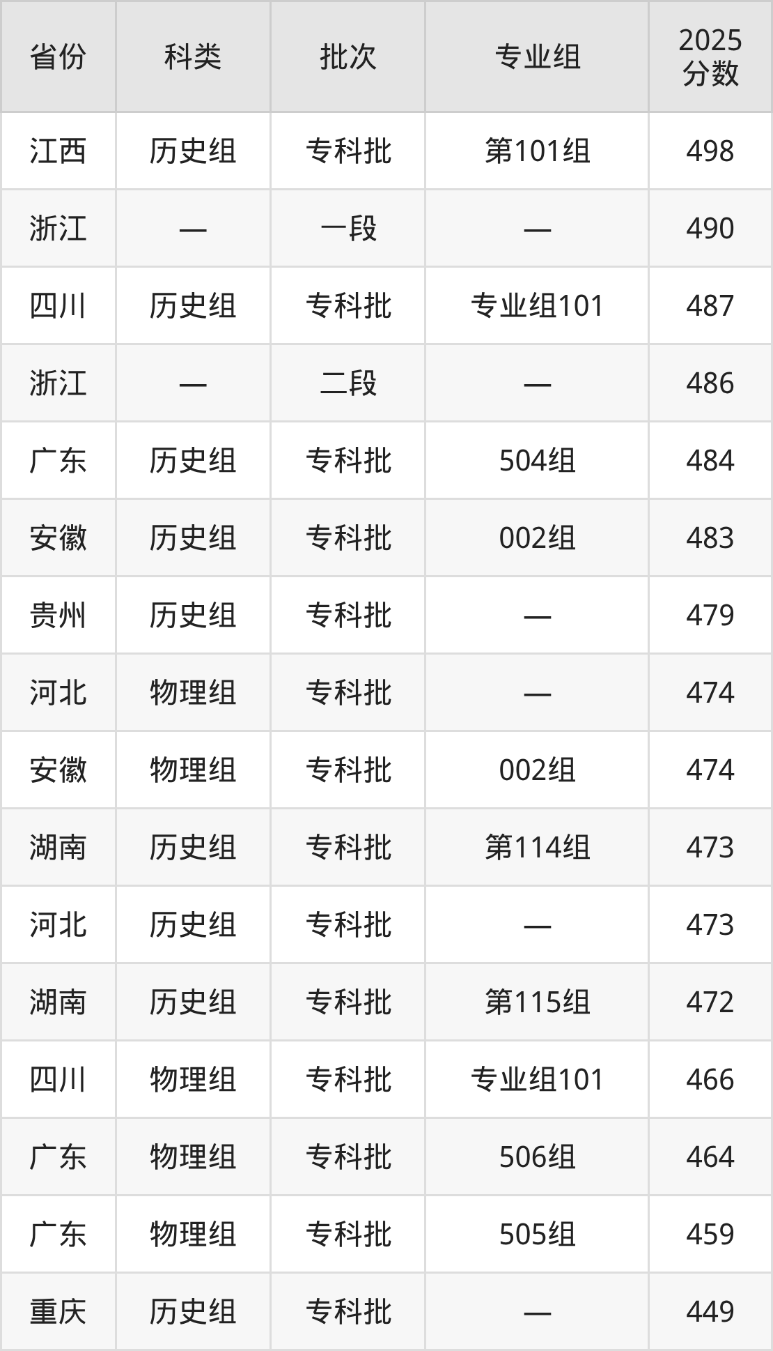 而江西地区历史组考生的分数门槛最高,2025年长沙航空职业技术学院第101组在江西招生最低分为498分,考生至少要超专科线208分才有可能被录取。