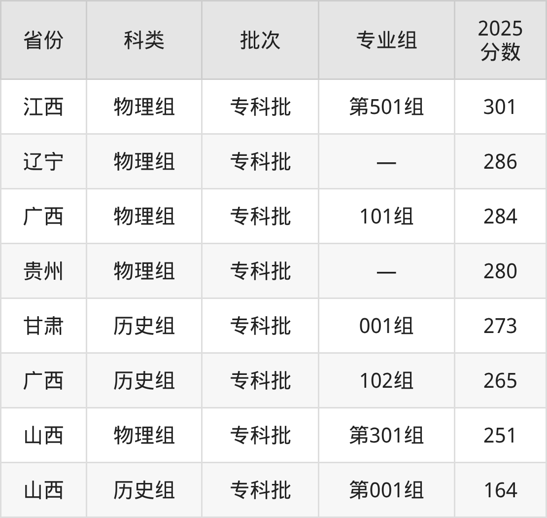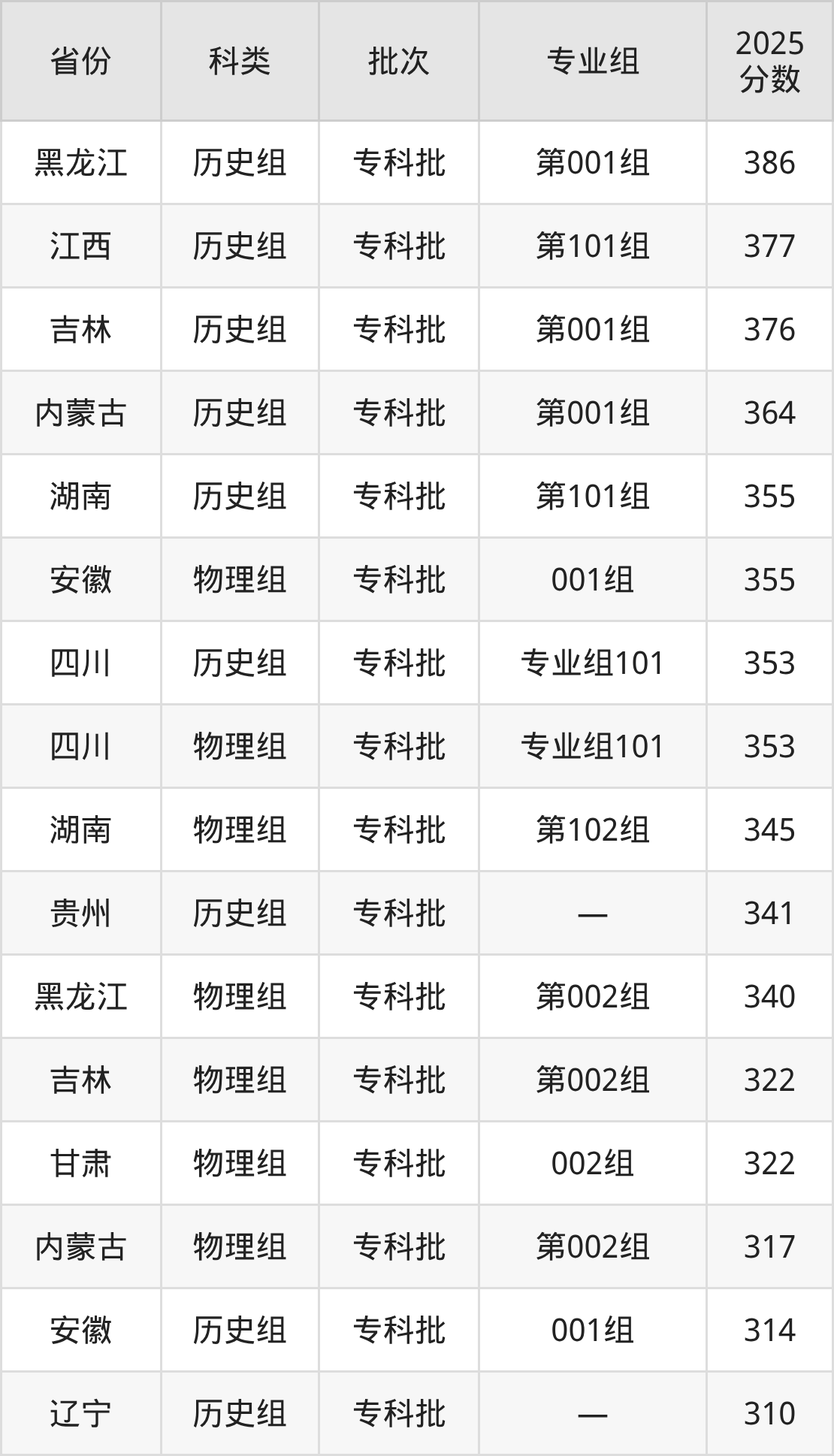 而黑龙江地区历史组考生的分数门槛最高,2025年辽宁工程职业学院第001组在黑龙江招生最低分为386分,考生至少要超专科线226分才有可能被录取。