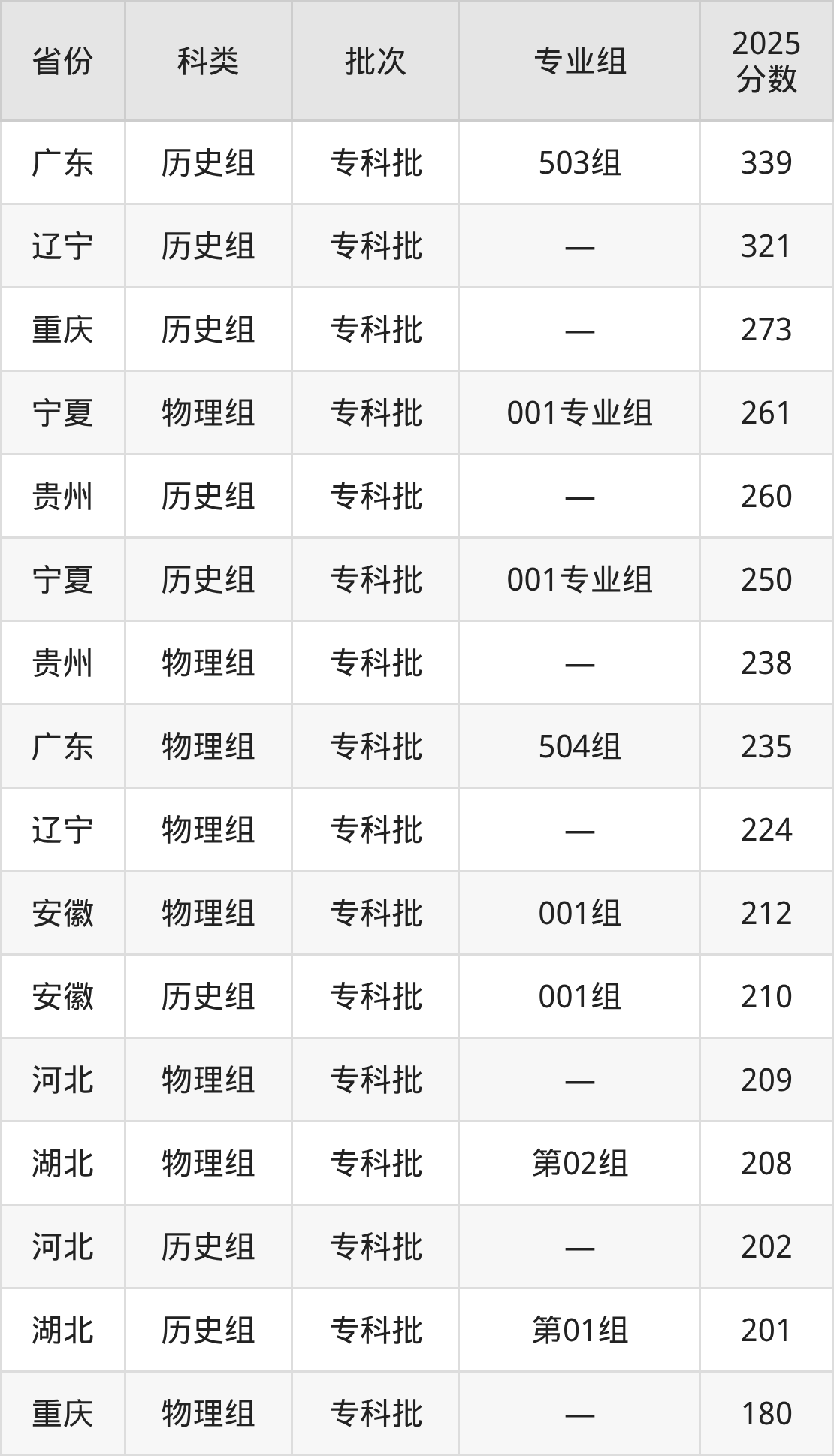 而广东地区历史组考生的分数门槛最高,2025年民办四川天一学院503组在广东招生最低分为339分,考生至少要超专科线124分才有可能被录取。
