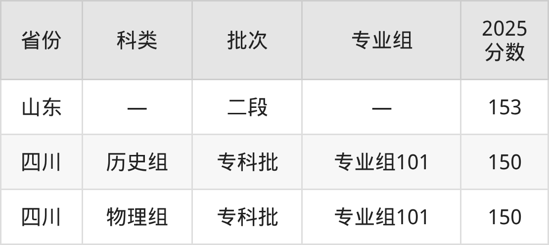 2025年民办四川天一学院在全国普通批次招生的录取分数范围位于150~339分之间,其中省内分数在150分,历史组最低分专业组为“专业组101”,考生150分即可报考,物理组最低分专业组为“专业组101”,考生150分即可报考。