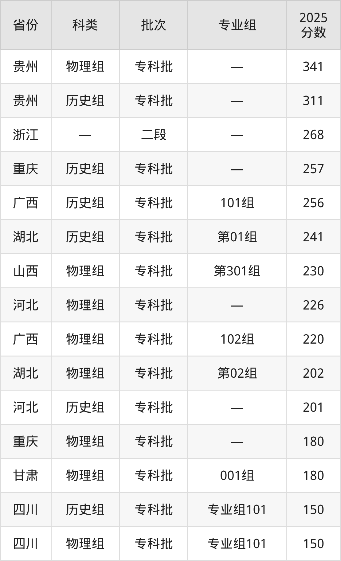 而贵州地区物理组考生的分数门槛最高,2025年重庆应用技术职业学院在贵州招生最低分为341分,考生至少要超专科线161分才有可能被录取。