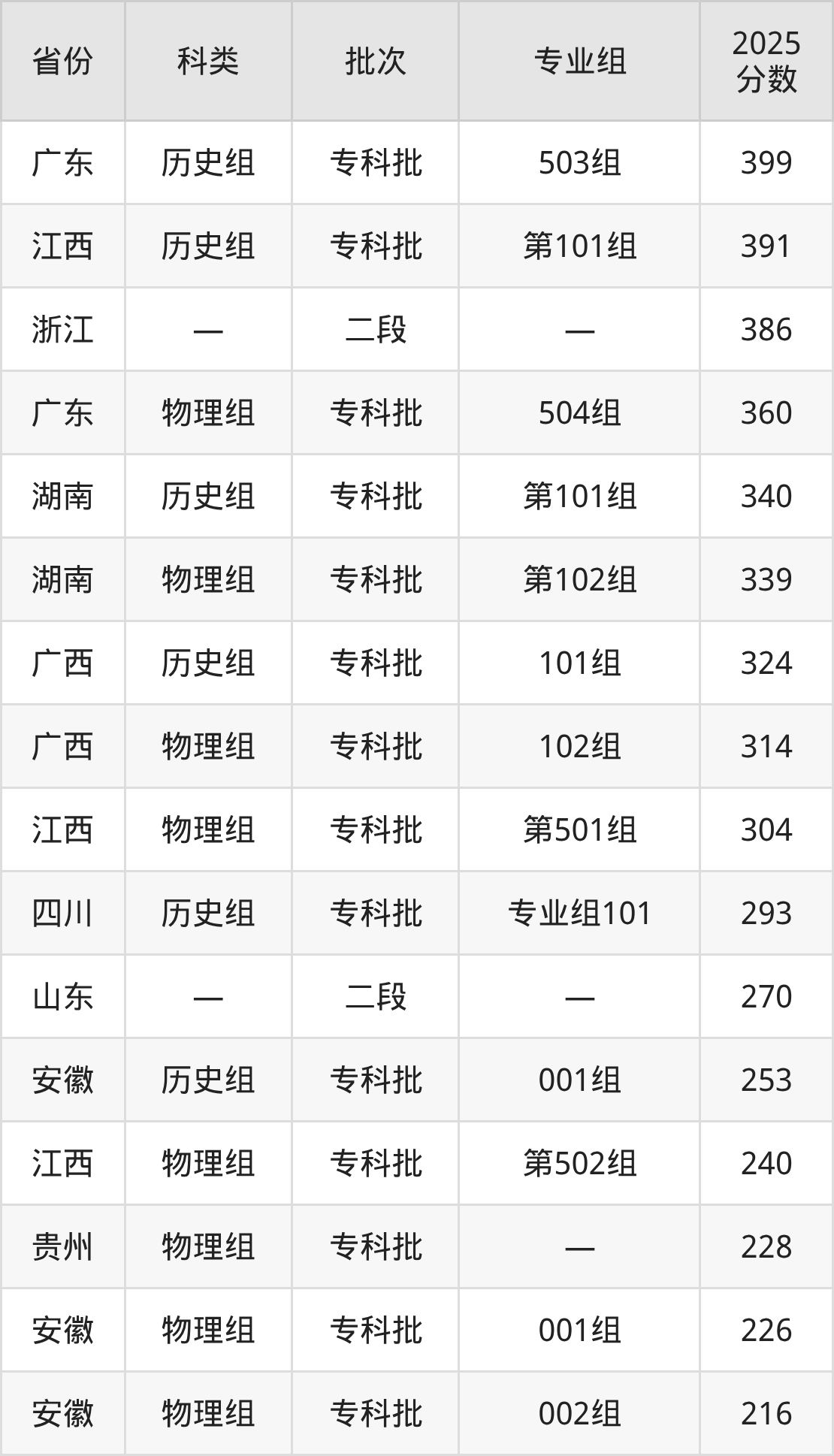 而广东地区历史组考生的分数门槛最高,2025年广西金融职业技术学院503组在广东招生最低分为399分,考生至少要超专科线184分才有可能被录取。