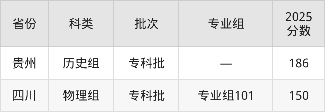 广西金融职业技术学院在壮族自治区外招生的最低分为150分,其中四川地区物理组考生上广西金融职业技术学院的分数门槛最低,考生成绩达专科线即可报考。其次是贵州历史组考生,上广西金融职业技术学院至少要超专科线6分(186分)。
