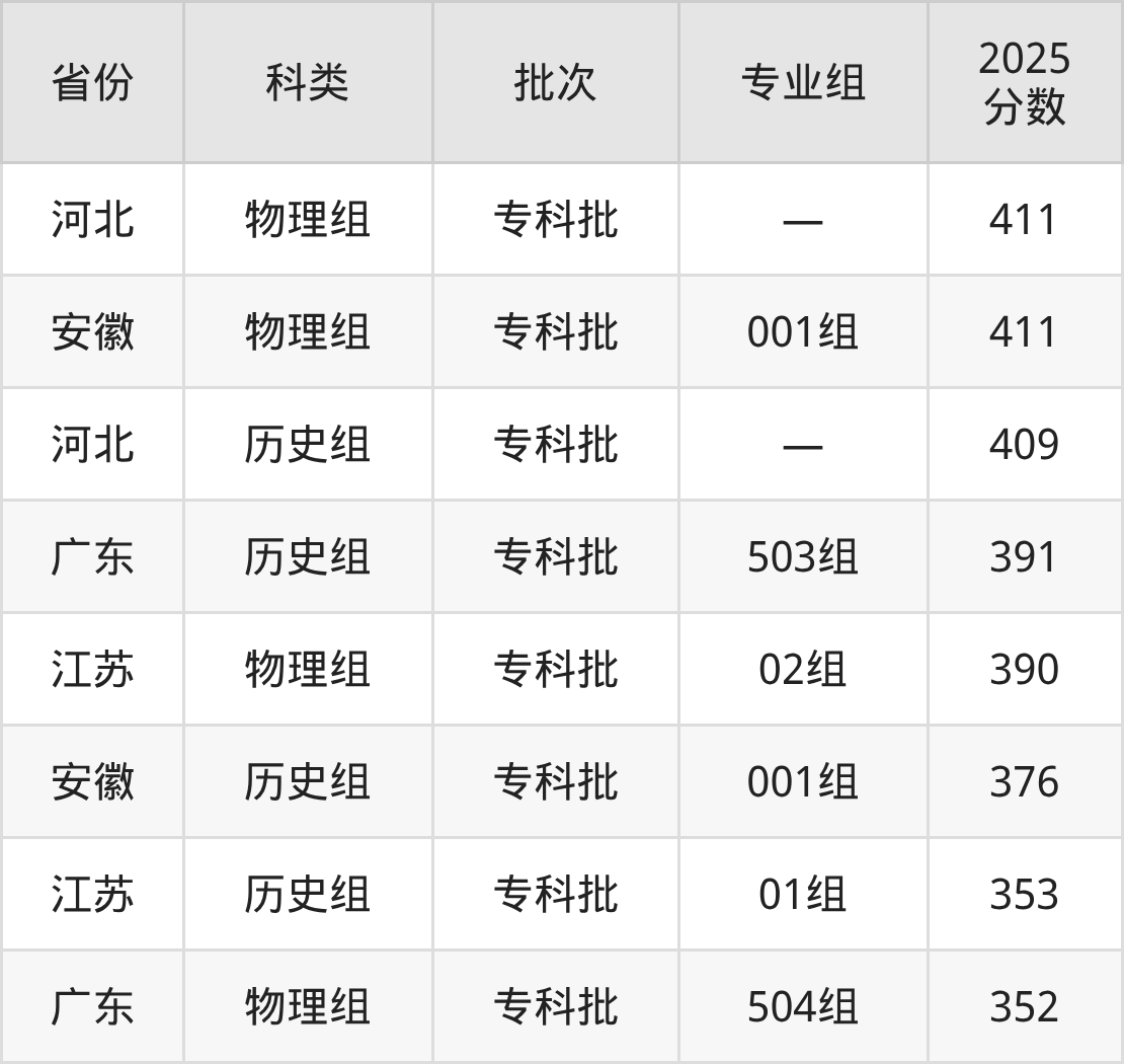 而河北地区物理组考生的分数门槛最高,2025年马鞍山职业技术学院在河北招生最低分为411分,考生至少要超专科线211分才有可能被录取。