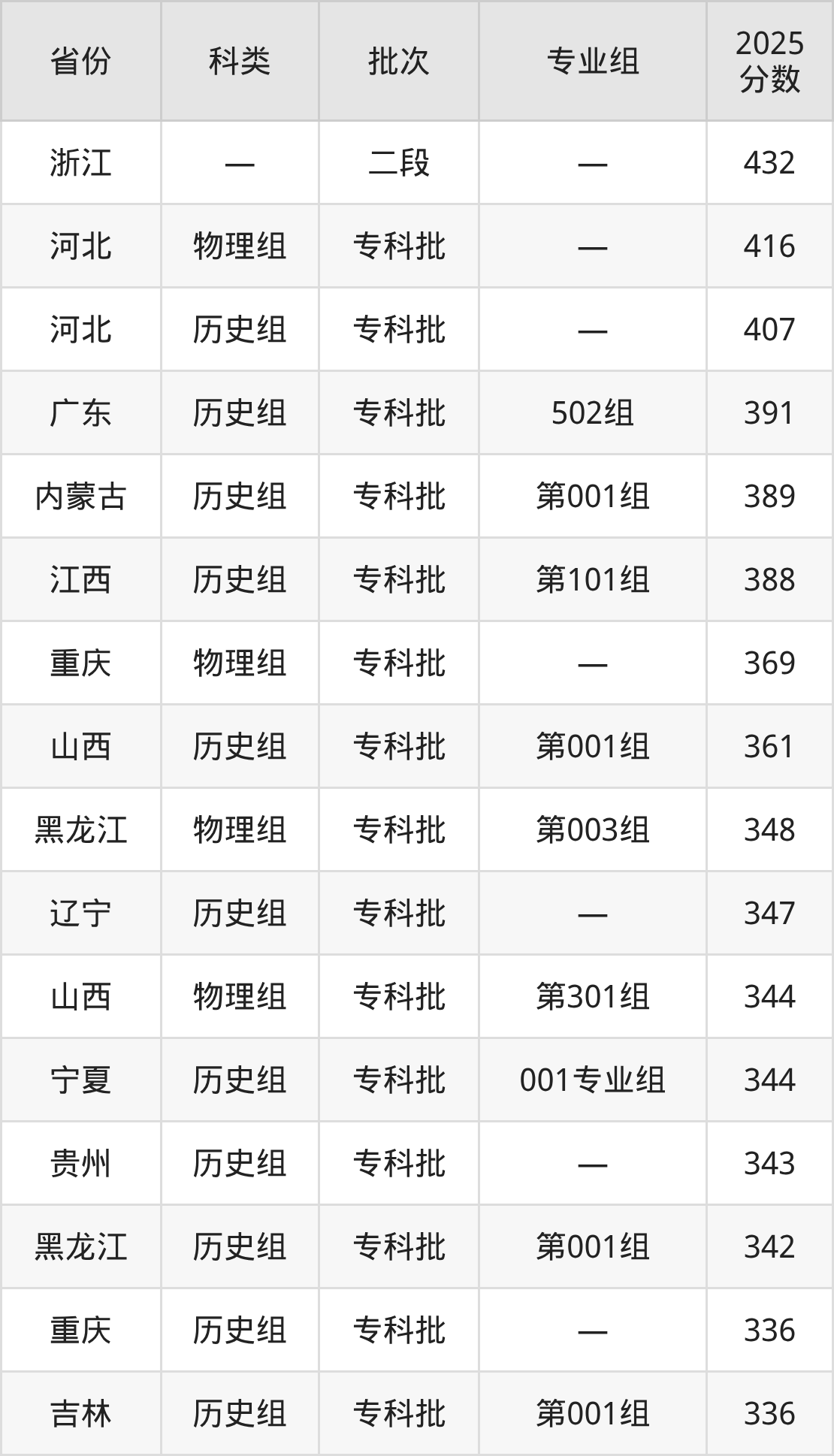 而浙江地区考生的分数门槛最高,2025年周口职业技术学院在浙江招生最低分为432分,考生至少要超二段线164分才有可能被录取。