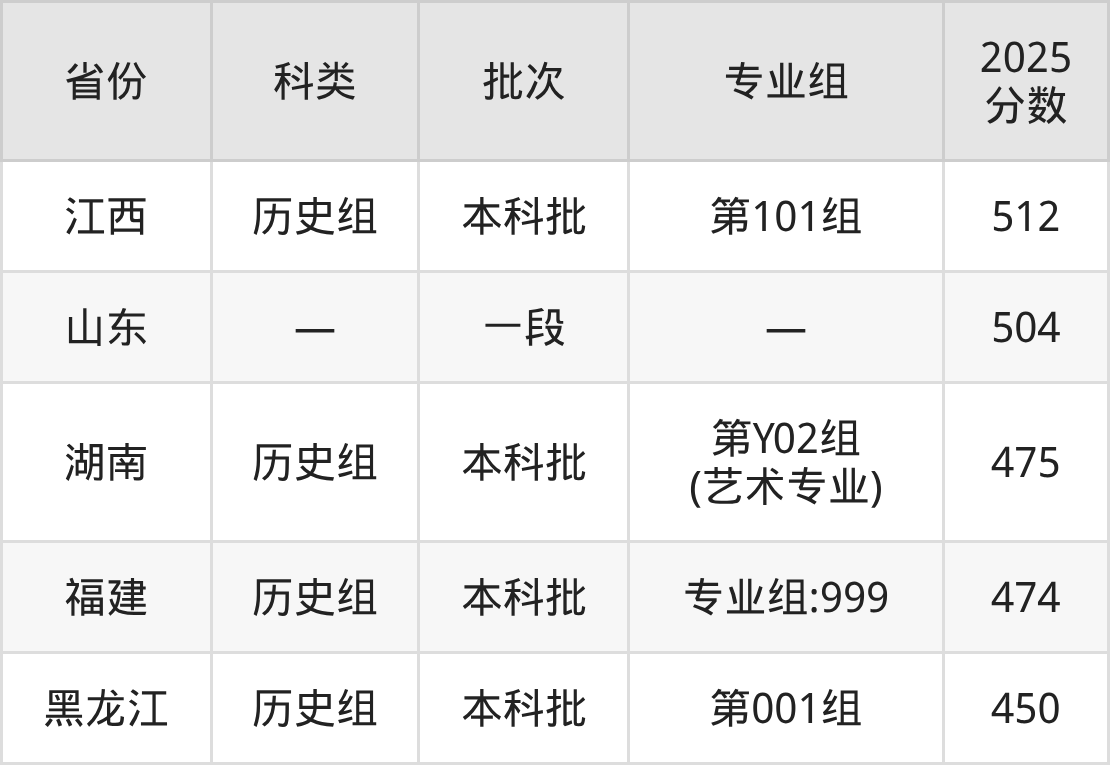 而江西地区历史组考生的分数门槛最高,2025年哈尔滨音乐学院第101组在江西招生最低分为512分,考生至少要超本科线26分才有可能被录取。