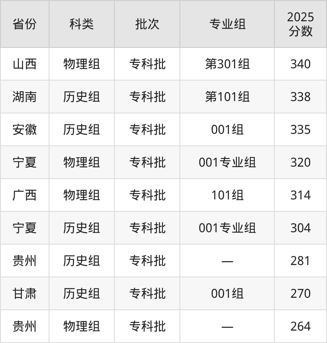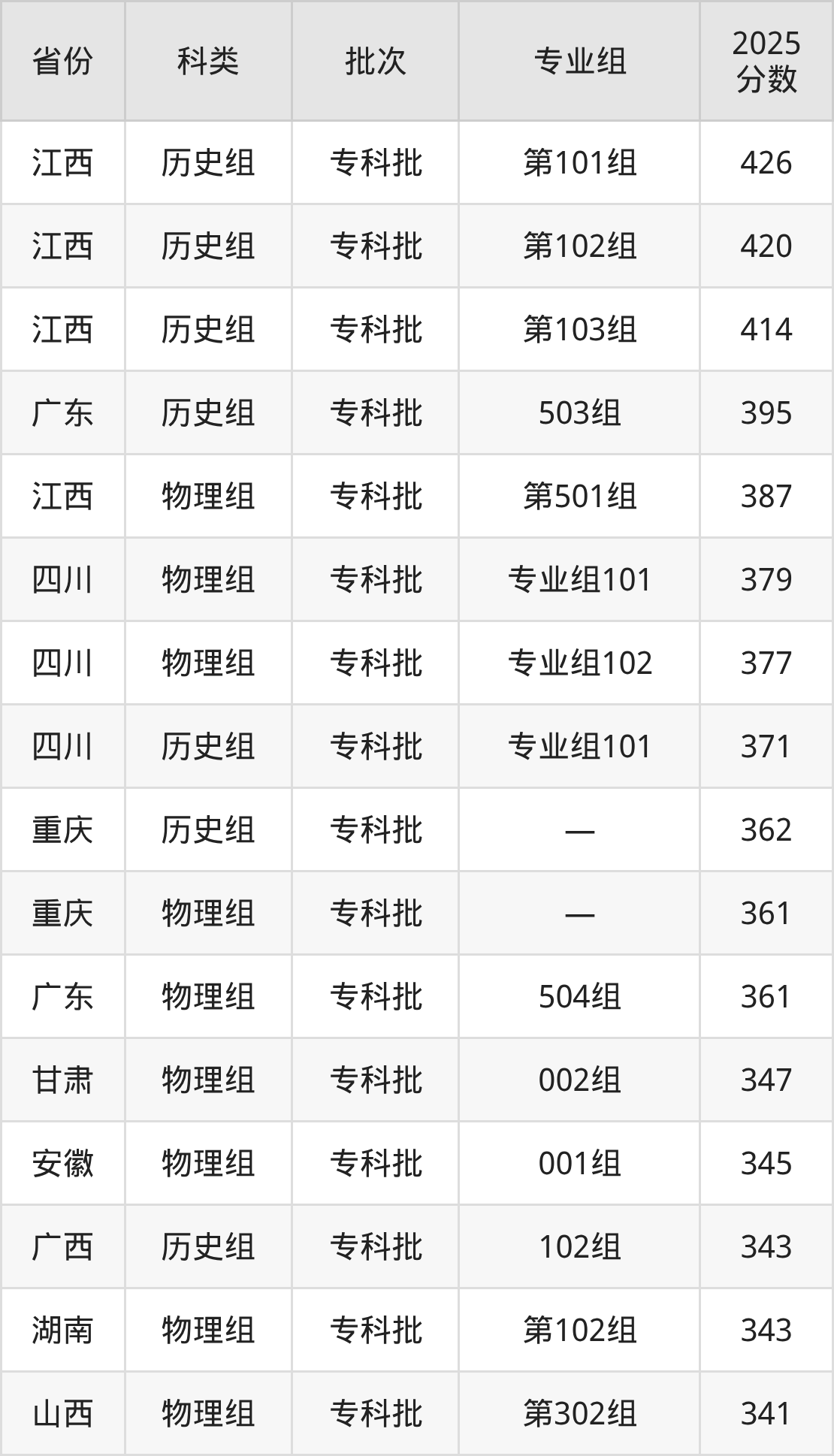 而江西地区历史组考生的分数门槛最高,2025年湖南九嶷职业技术学院第101组在江西招生最低分为426分,考生至少要超专科线136分才有可能被录取。