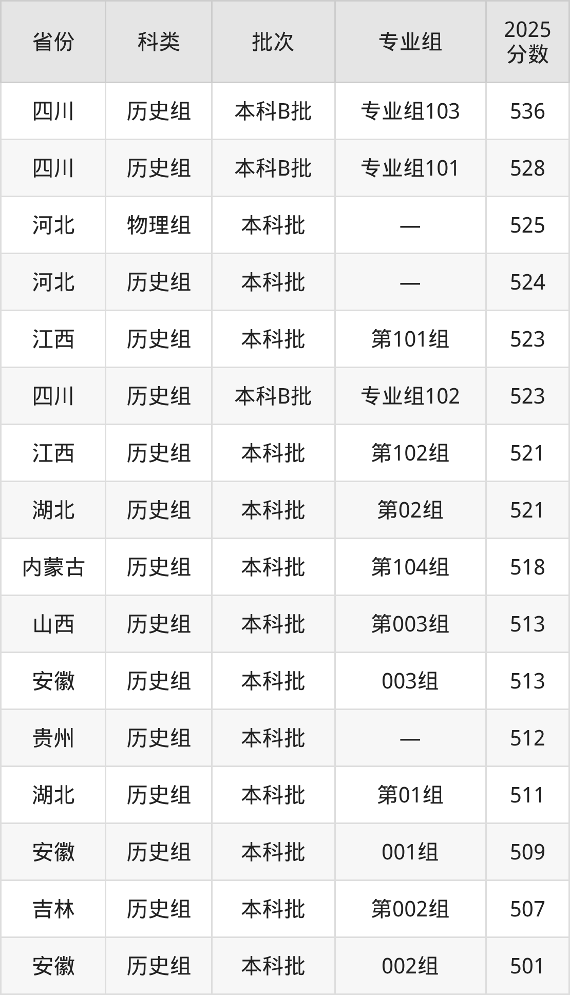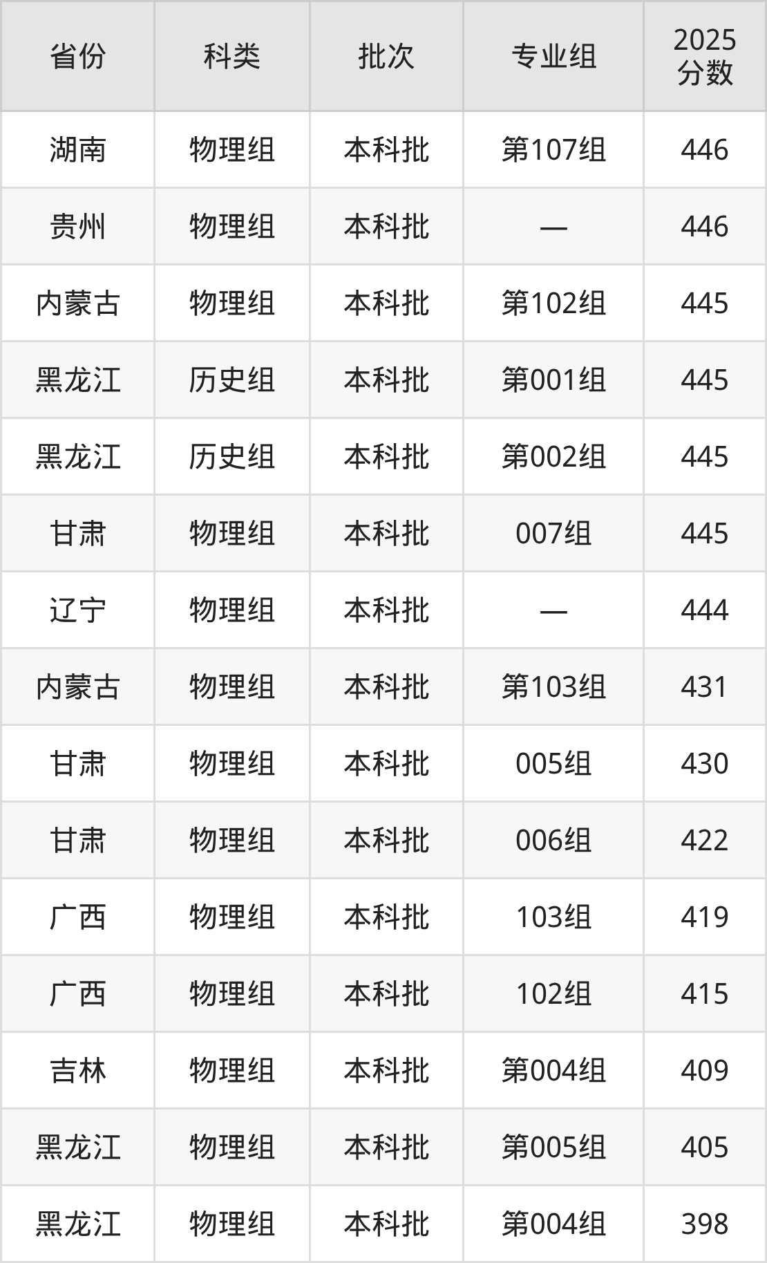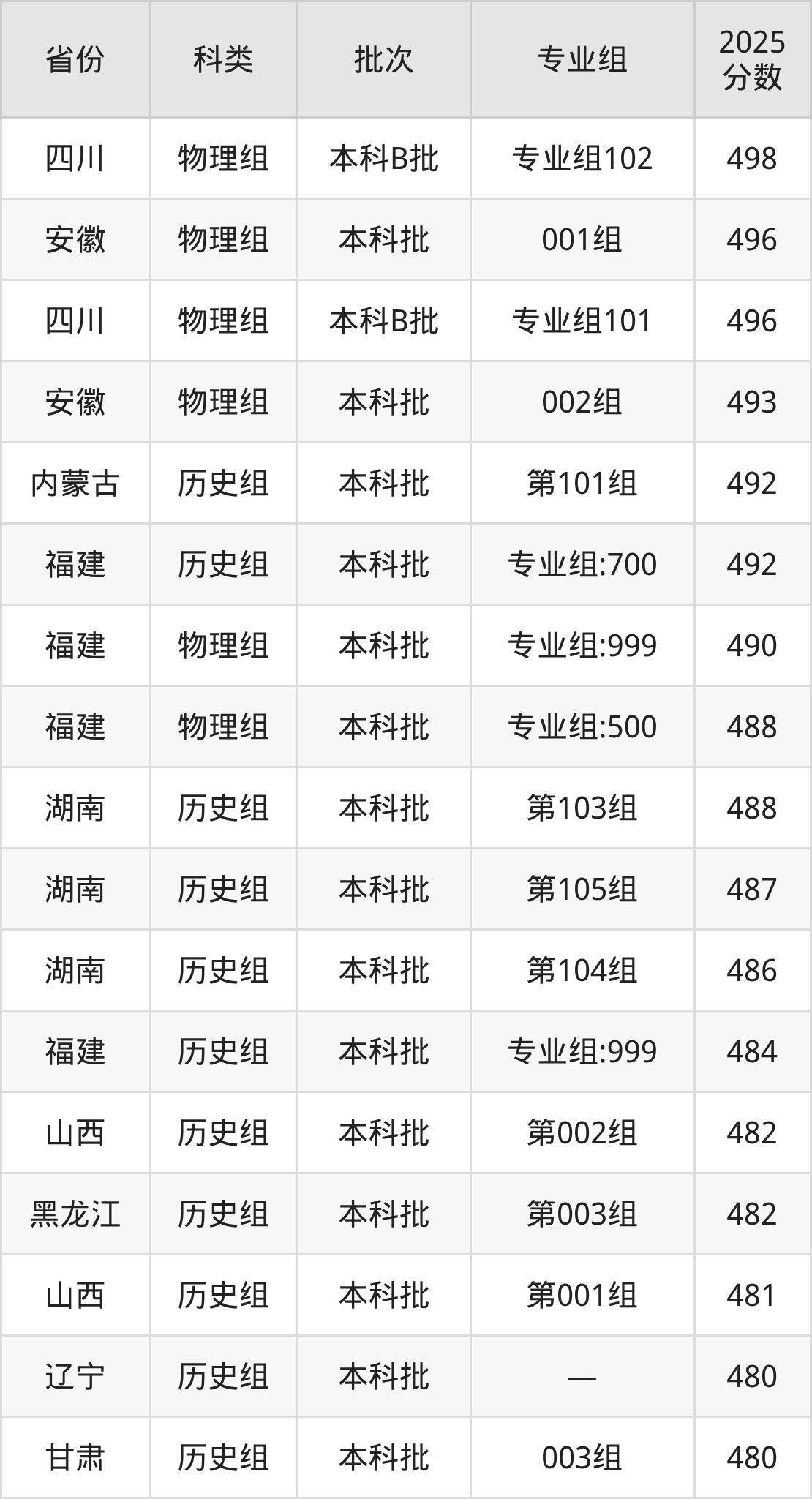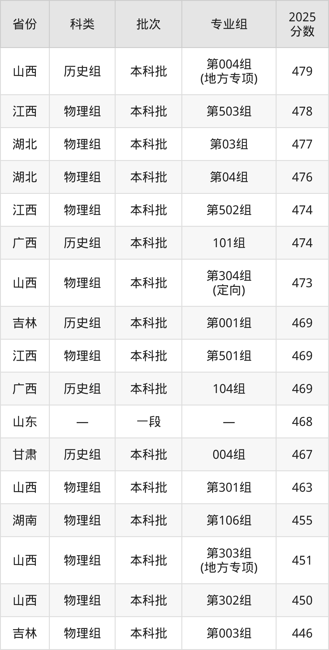2025年长治学院在全国普通批次招生的录取分数范围位于398~536分之间,其中省内分数范围为450分~513分,历史组最低分专业组为“第004组(地方专项)”,考生479分即可报考,物理组最低分专业组为“第302组”,考生450分即可报考。