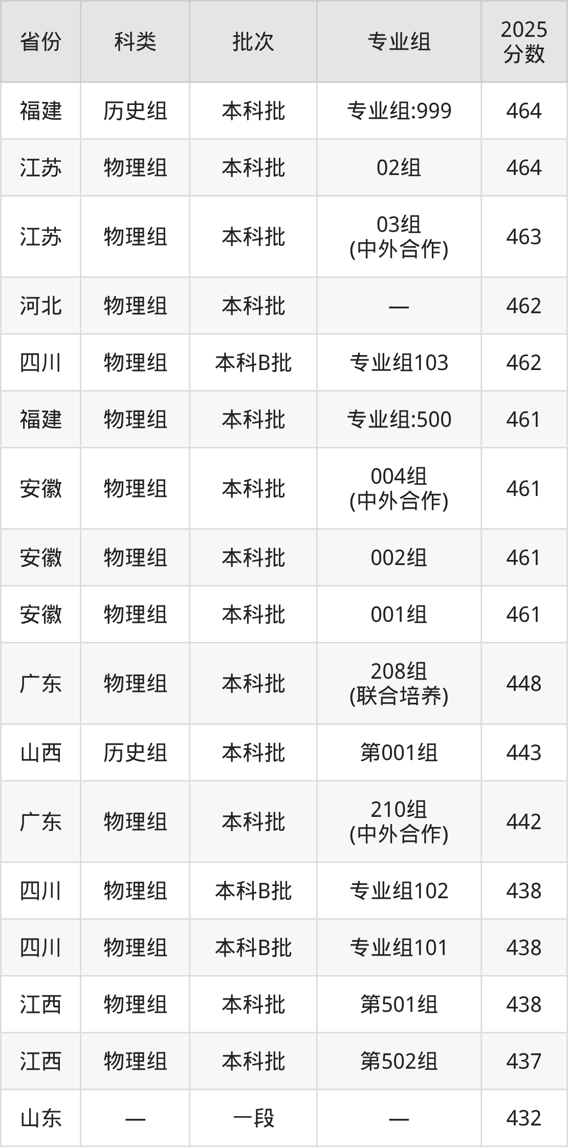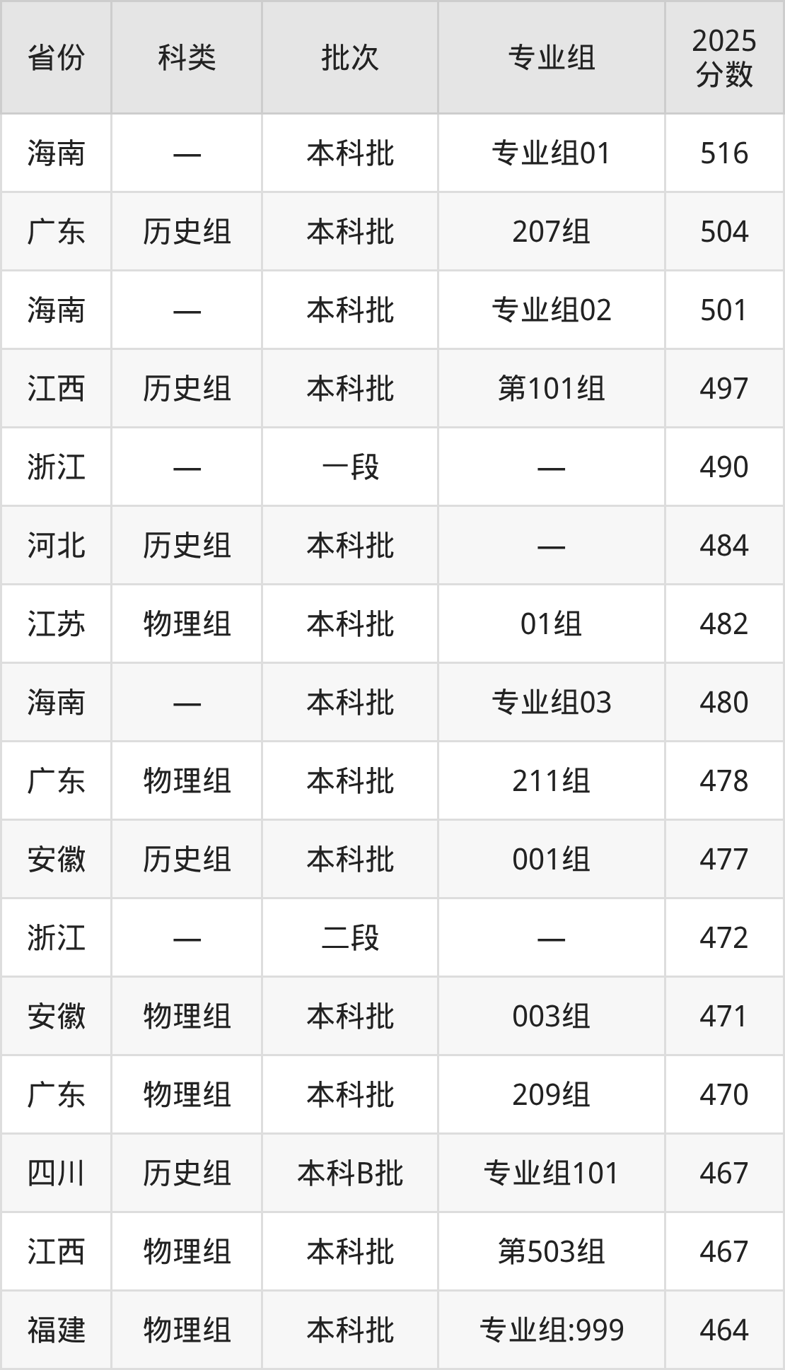 2025年泉州信息工程学院在全国普通批次招生的录取分数范围位于360~516分之间,其中省内分数范围为461分~464分,物理组最低分专业组为“专业组:500”,考生461分即可报考,历史组最低分专业组为“专业组:999”,考生464分即可报考。