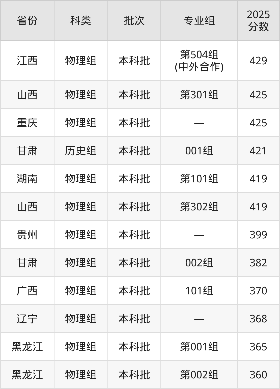 泉州信息工程学院在省外招生的最低分为360分,其中黑龙江地区物理组考生上泉州信息工程学院的分数门槛最低,考生成绩达本科线即可报考。其次是辽宁物理组考生,上泉州信息工程学院至少要超本科线1分(368分)。