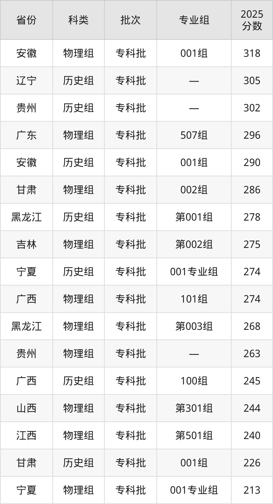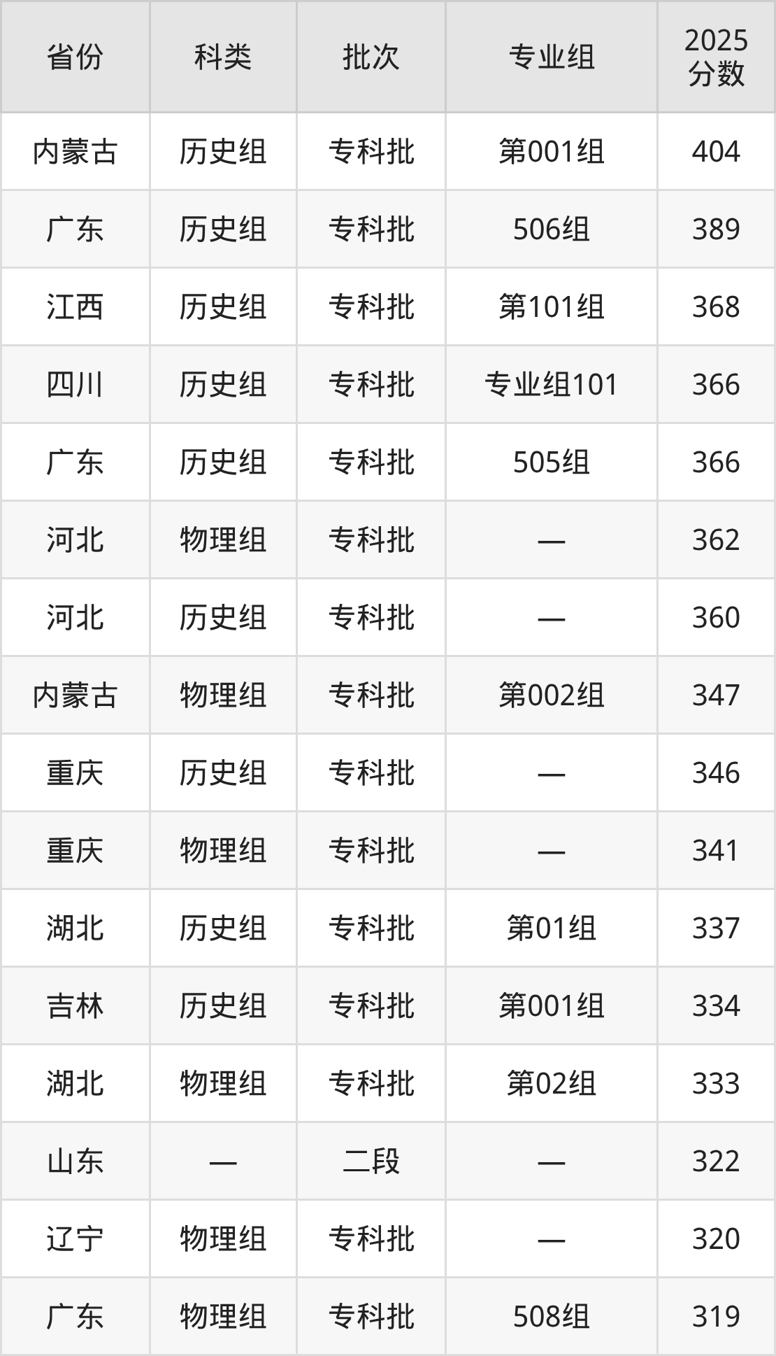 而内蒙古地区历史组考生的分数门槛最高,2025年黑龙江农业经济职业学院第001组在内蒙古招生最低分为404分,考生至少要超专科线244分才有可能被录取。