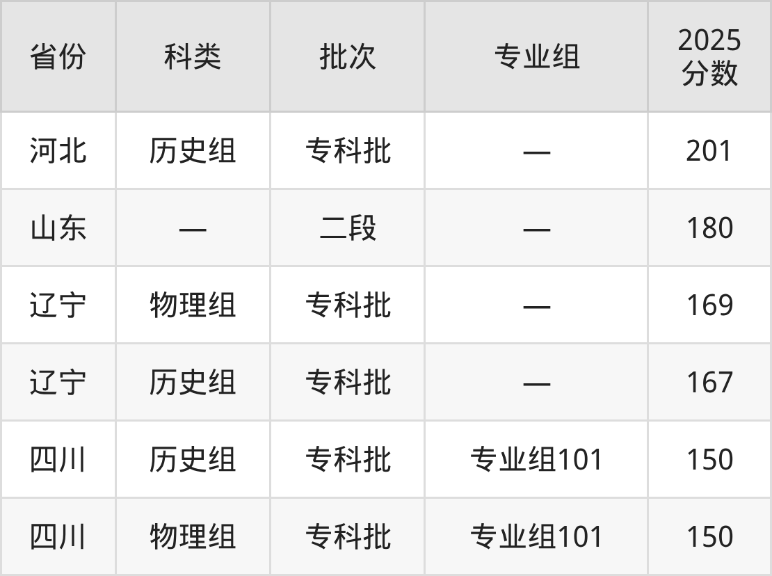 辽宁传媒学院在省外招生的最低分为150分,其中四川地区历史组考生上辽宁传媒学院的分数门槛最低,考生成绩达专科线即可报考。其次是山东考生,上辽宁传媒学院至少要超二段线30分(180分)。