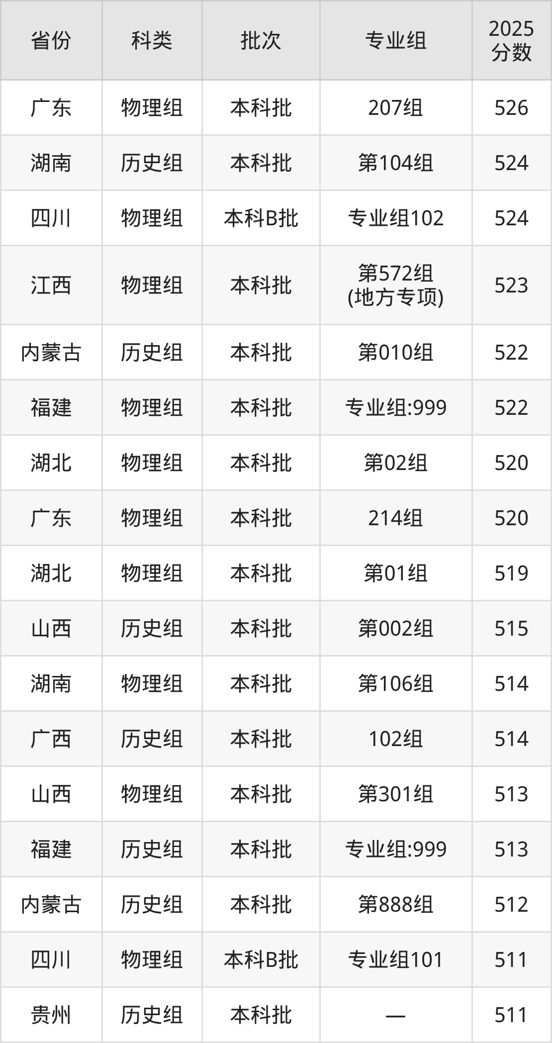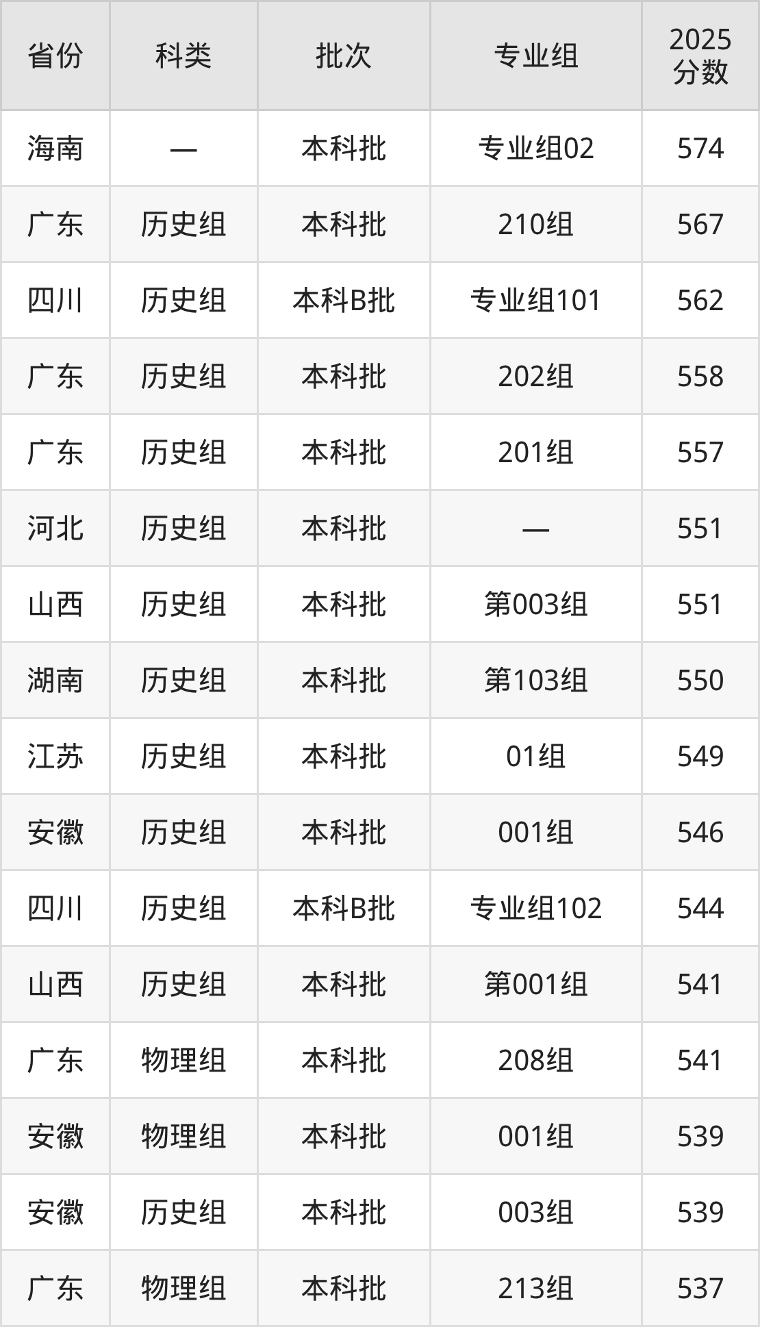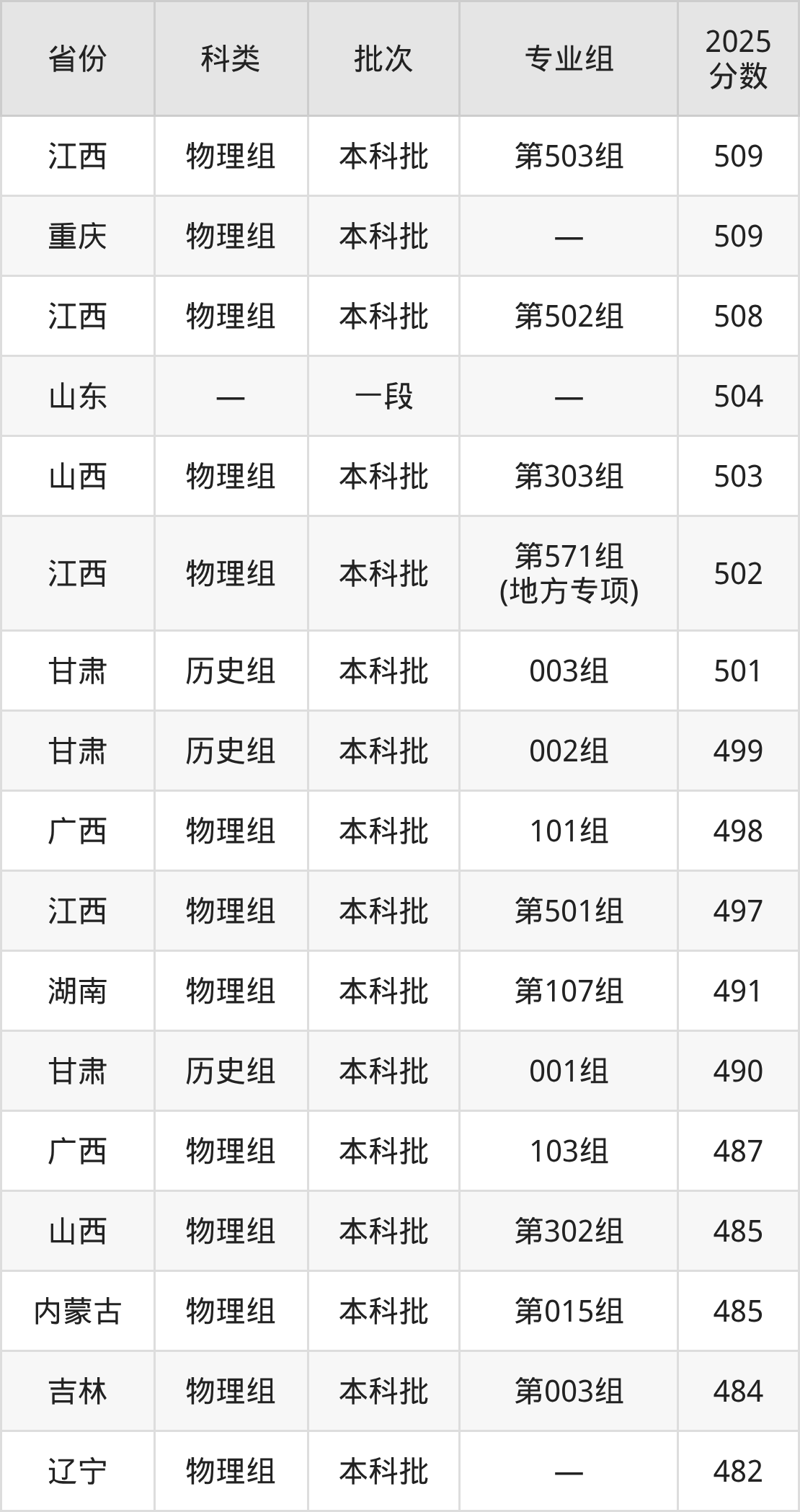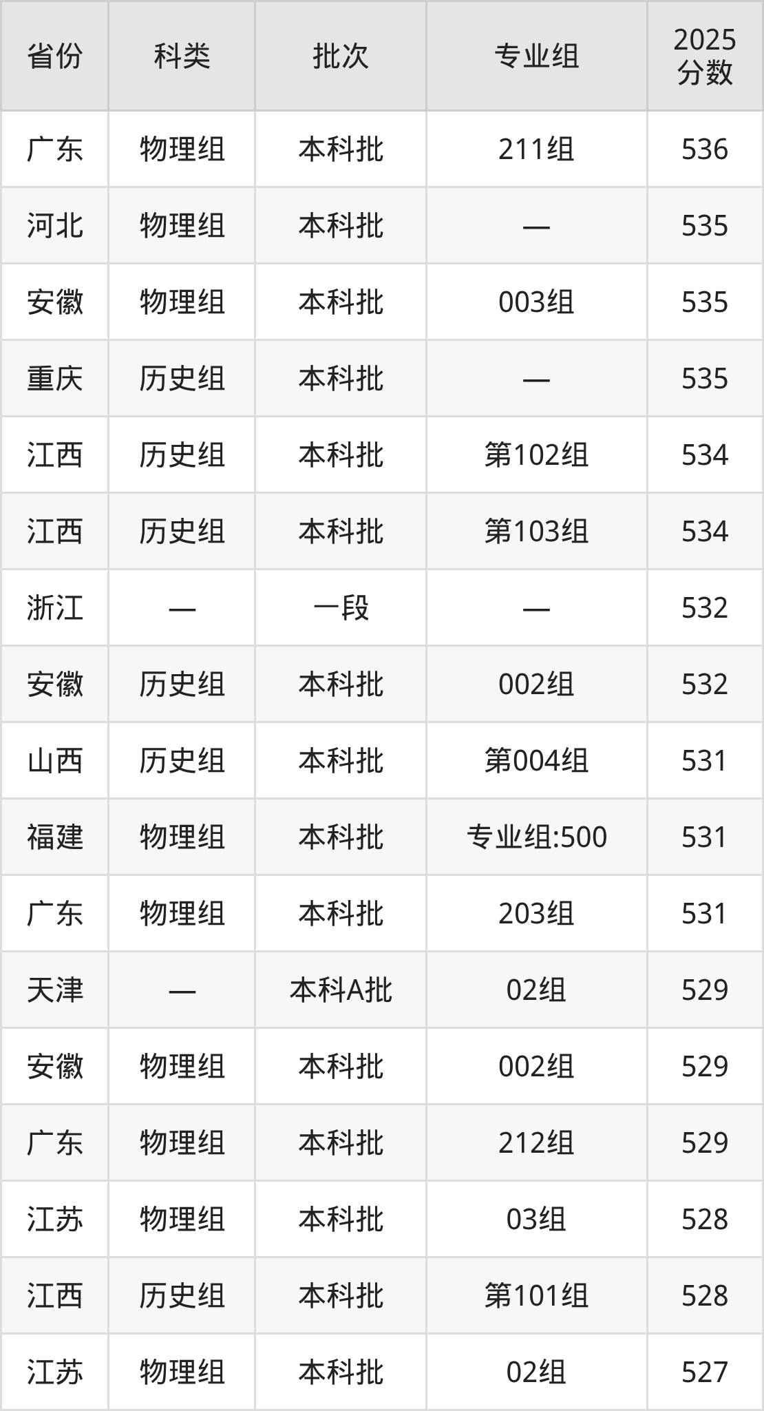 2025年景德镇陶瓷大学在全国普通批次招生的录取分数范围位于443~574分之间,其中省内分数范围为497分~534分,历史组最低分专业组为“第101组”,考生528分即可报考,物理组最低分专业组为“第501组”,考生497分即可报考。