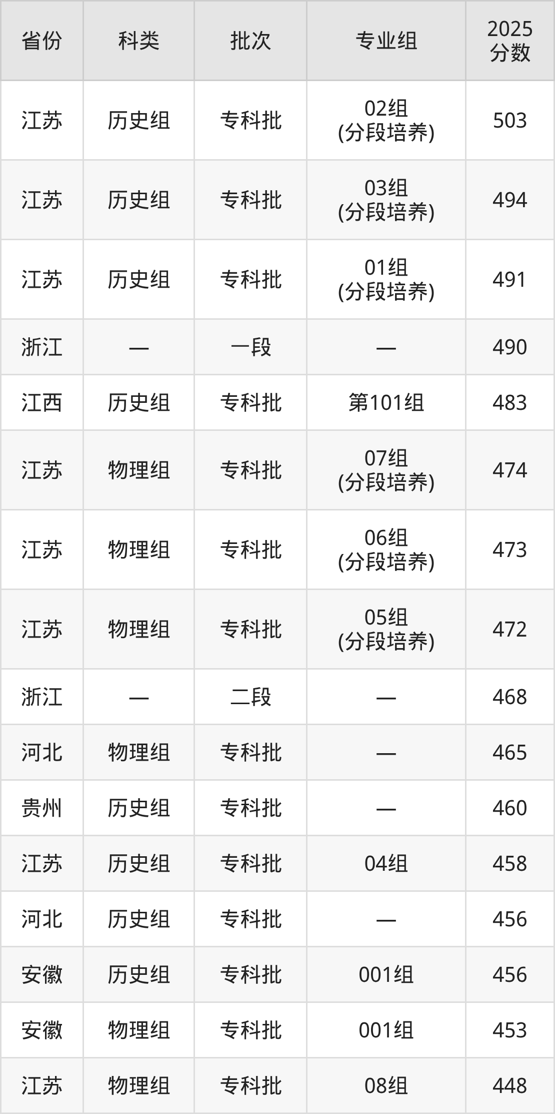 而浙江地区考生的分数门槛最高,2025年南京城市职业学院在浙江招生最低分为490分,考生至少要超一段线0分才有可能被录取。