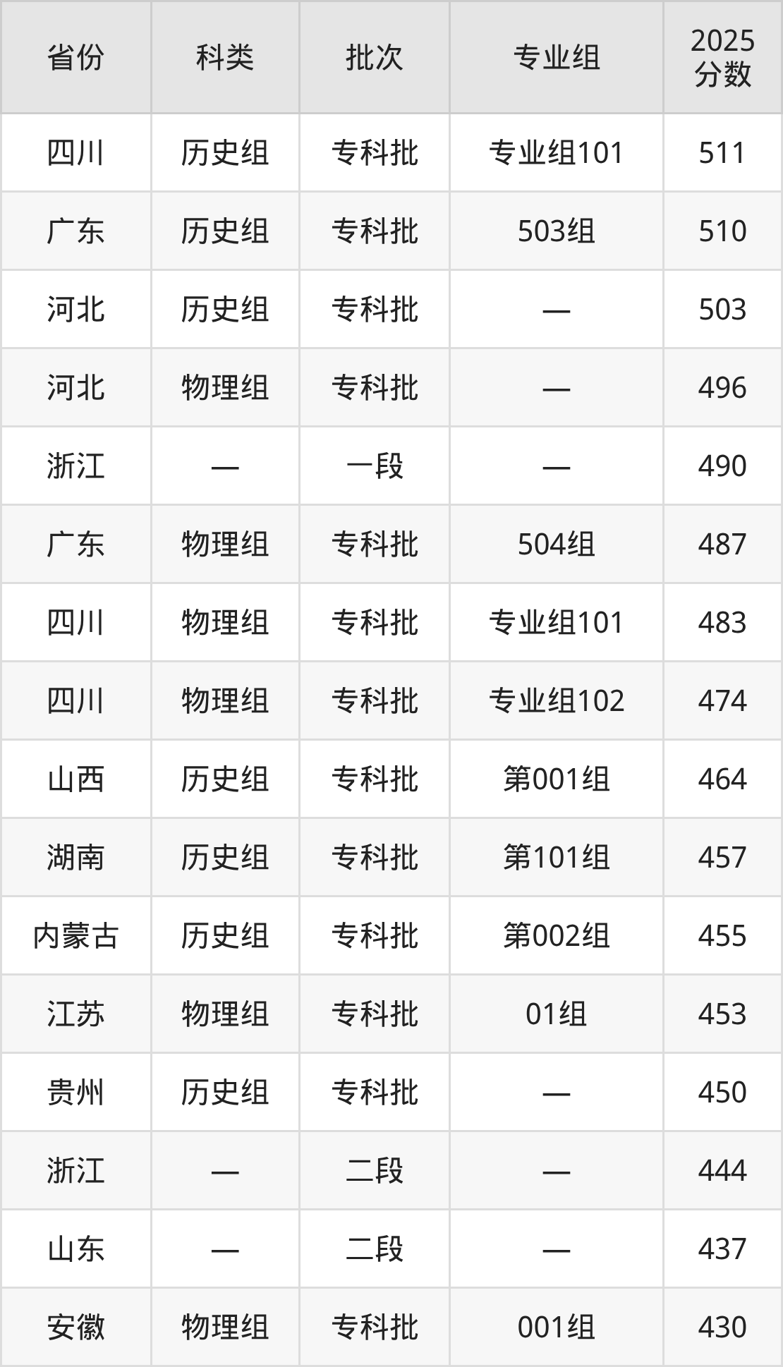 而广东地区历史组考生的分数门槛最高,2025年四川交通职业技术学院503组在广东招生最低分为510分,考生至少要超专科线295分才有可能被录取。