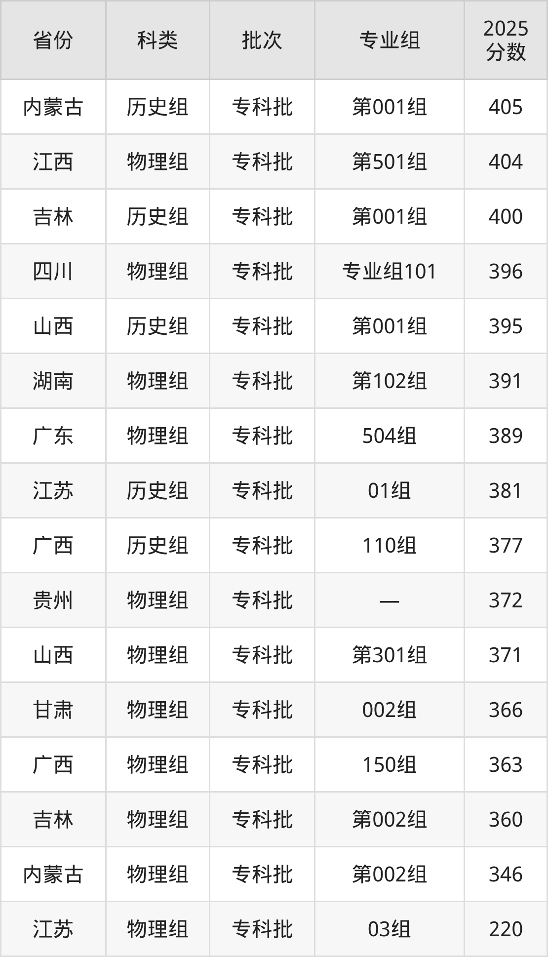 2025年江苏财经职业技术学院在全国普通批次招生的录取分数范围位于220~492分之间,其中省内分数范围为220分~492分,历史组最低分专业组为“01组”,考生381分即可报考,物理组最低分专业组为“03组”,考生220分即可报考。