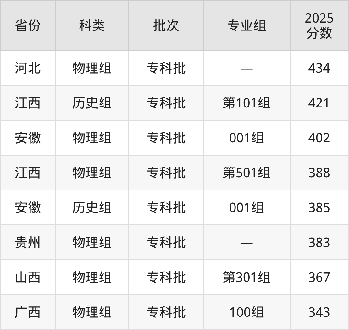 2025年安徽邮电职业技术学院在全国普通批次招生的录取分数范围位于343~434分之间,其中省内分数范围为385分~402分,物理组最低分专业组为“001组”,考生402分即可报考,历史组最低分专业组为“001组”,考生385分即可报考。