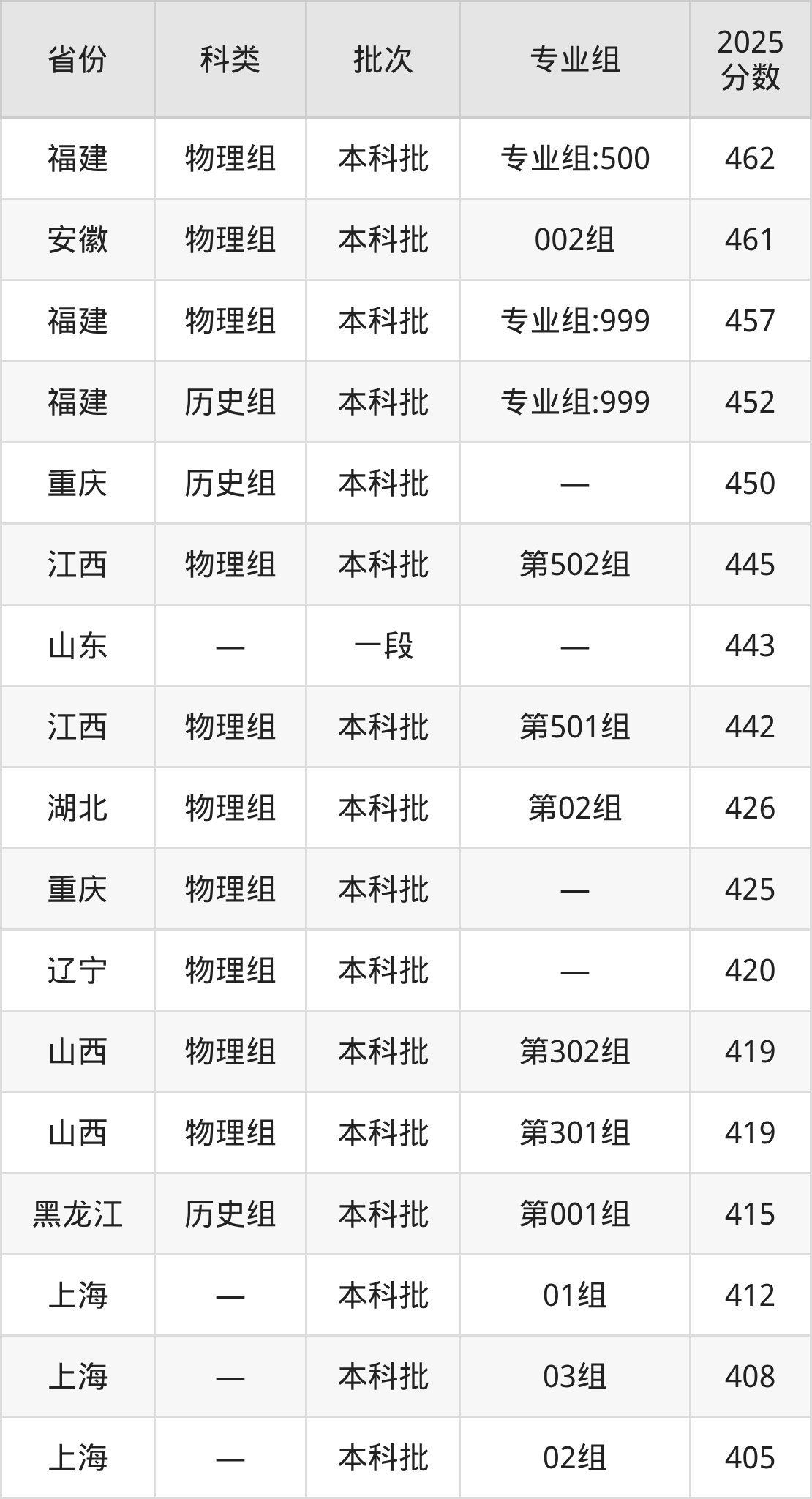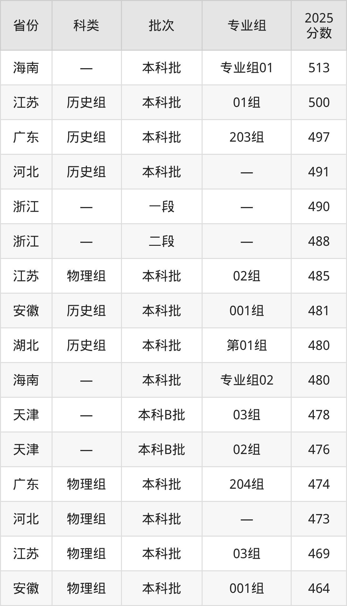 2025年合肥城市学院在全国普通批次招生的录取分数范围位于352~513分之间,其中省内分数范围为461分~481分,历史组最低分专业组为“001组”,考生481分即可报考,物理组最低分专业组为“002组”,考生461分即可报考。