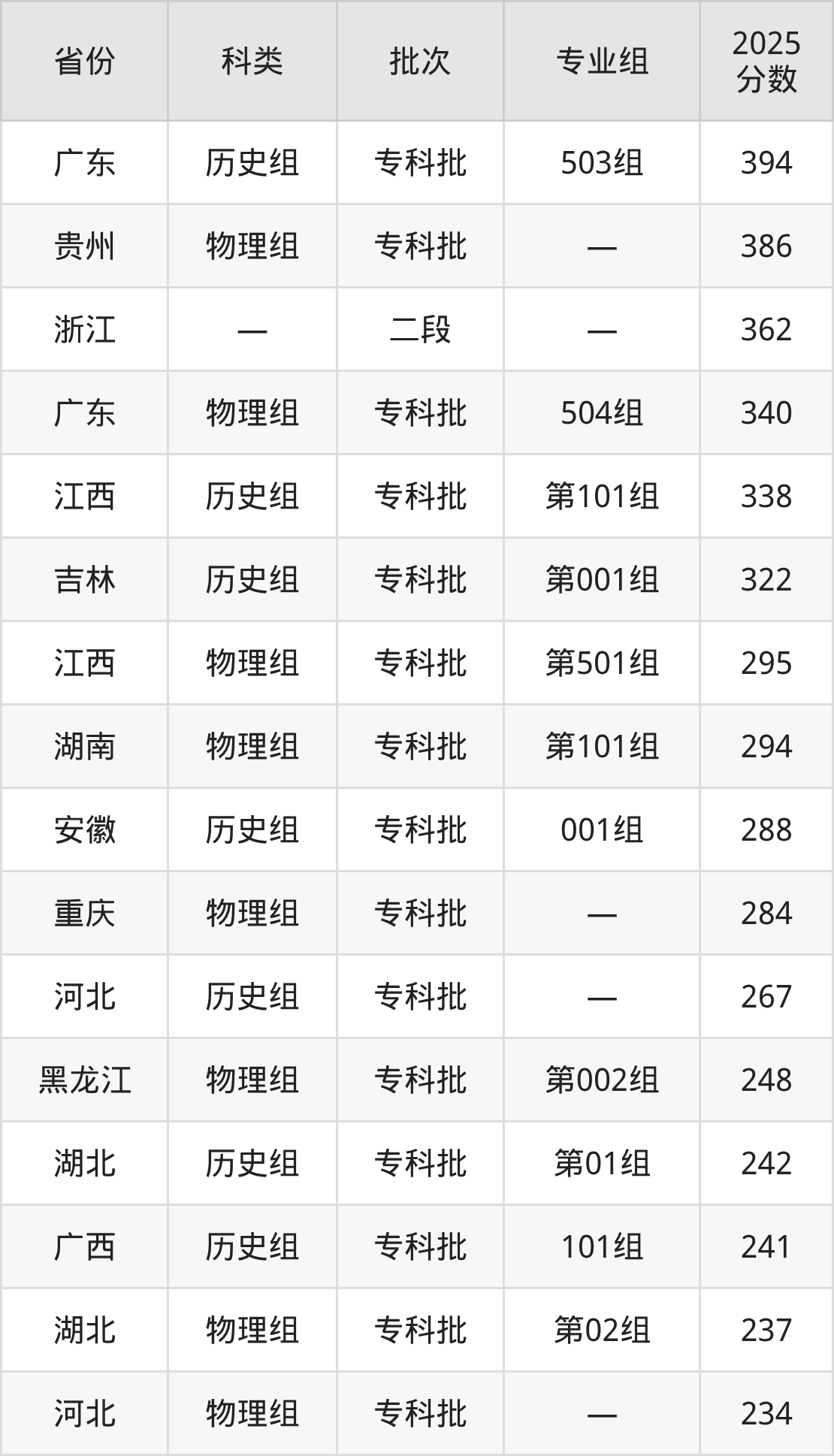 而广东地区历史组考生的分数门槛最高,2025年泉州轻工职业学院503组在广东招生最低分为394分,考生至少要超专科线179分才有可能被录取。