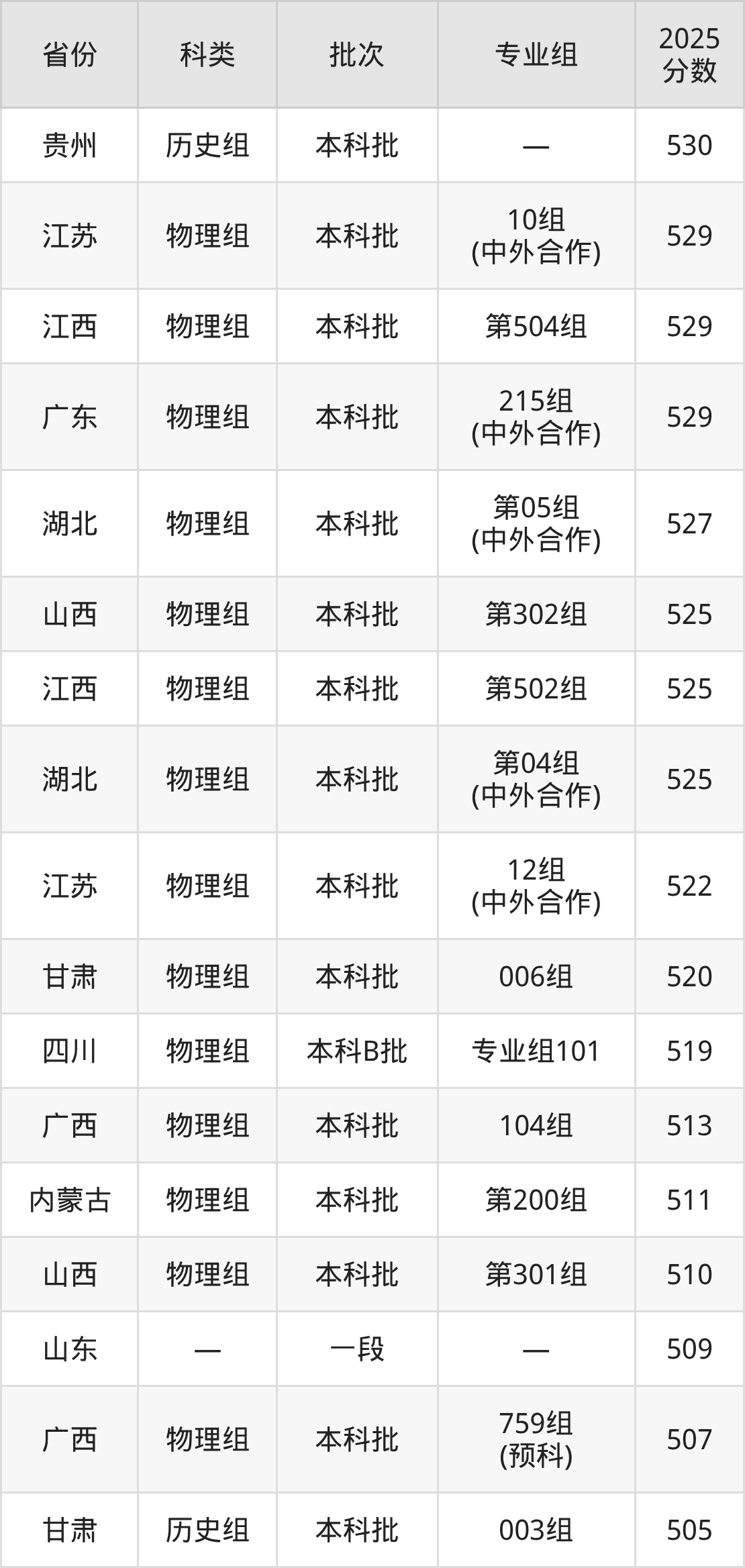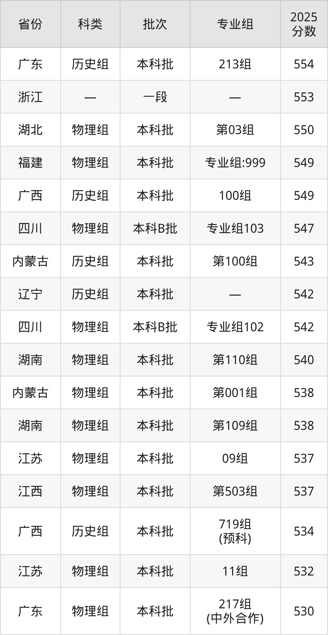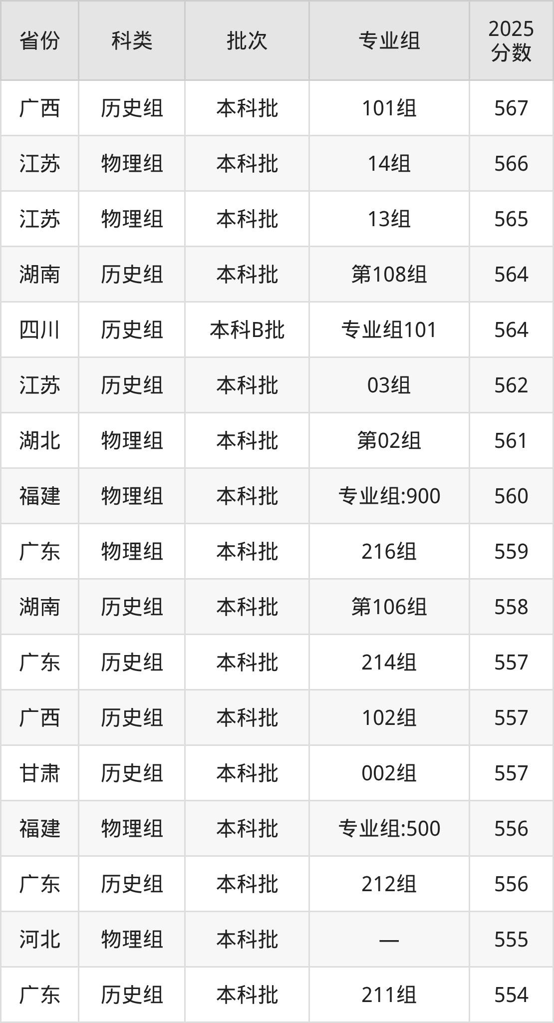 2025年江苏师范大学在全国普通批次招生的录取分数范围位于467~649分之间,其中省内分数范围为522分~577分,物理组最低分专业组为“12组(中外合作)”,考生522分即可报考,历史组最低分专业组为“03组”,考生562分即可报考。