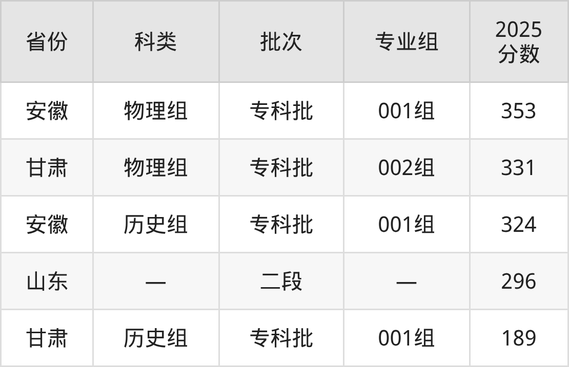 而安徽地区物理组考生的分数门槛最高,2025年临沂职业学院001组在安徽招生最低分为353分,考生至少要超专科线153分才有可能被录取。
