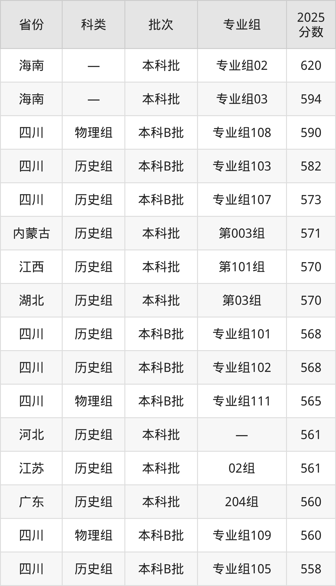 而海南地区考生的分数门槛最高,2025年西华大学专业组02在海南招生最低分为620分,考生至少要超本科线140分才有可能被录取。