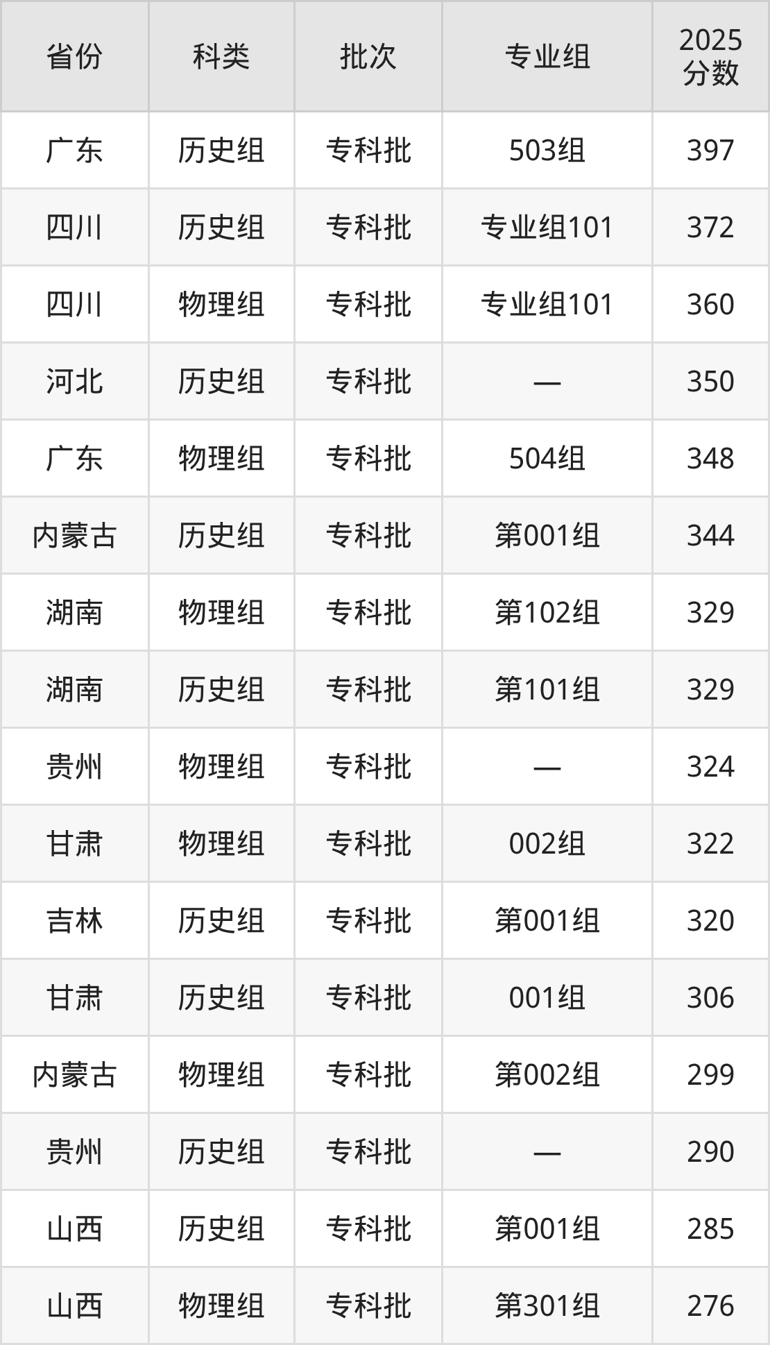 而广东地区历史组考生的分数门槛最高,2025年张家口职业技术学院503组在广东招生最低分为397分,考生至少要超专科线182分才有可能被录取。
