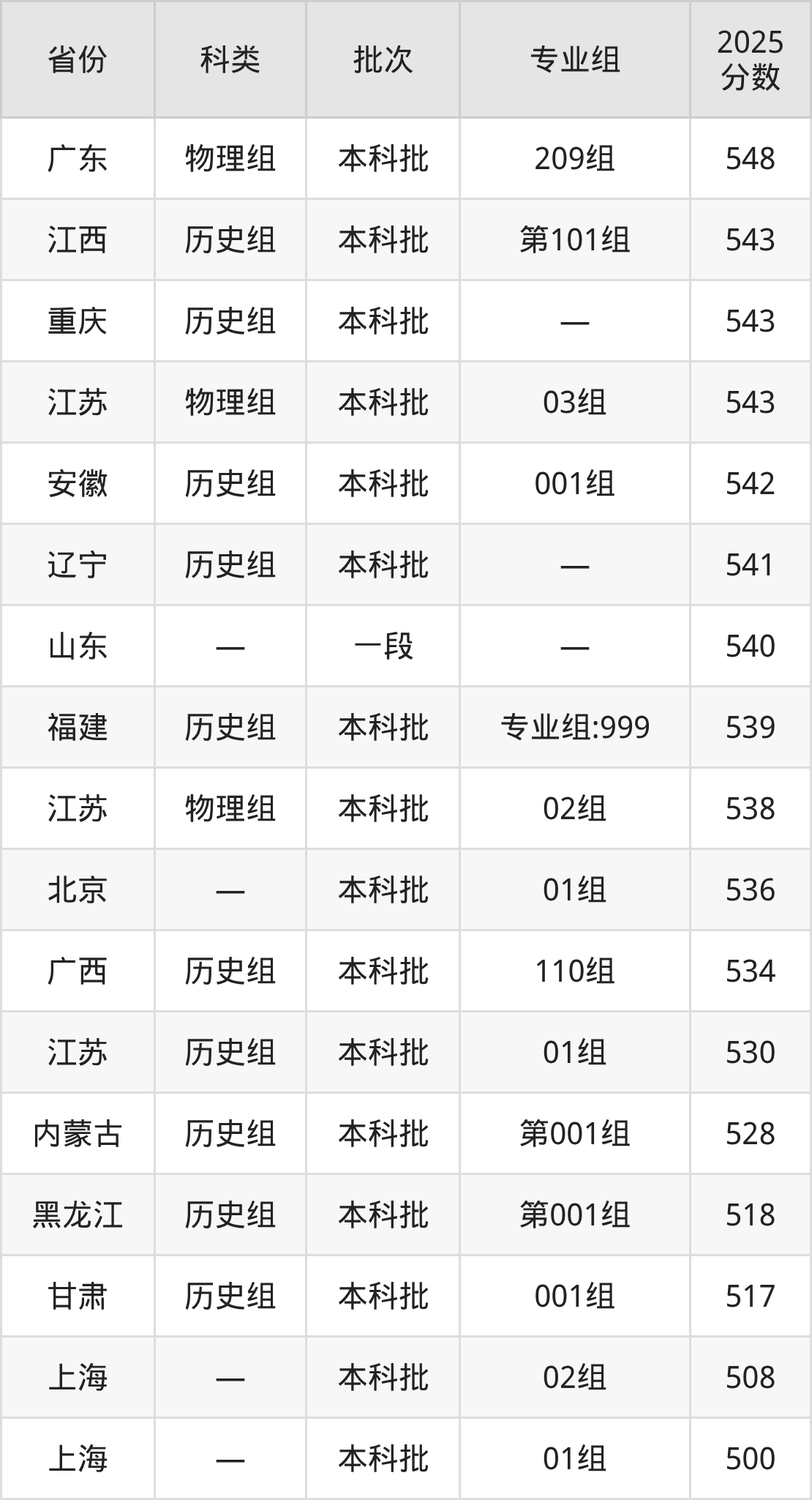 2025年南京艺术学院在全国普通批次招生的录取分数范围位于500~642分之间,其中省内分数范围为530分~543分,物理组最低分专业组为“02组”,考生538分即可报考,历史组最低分专业组为“01组”,考生530分即可报考。