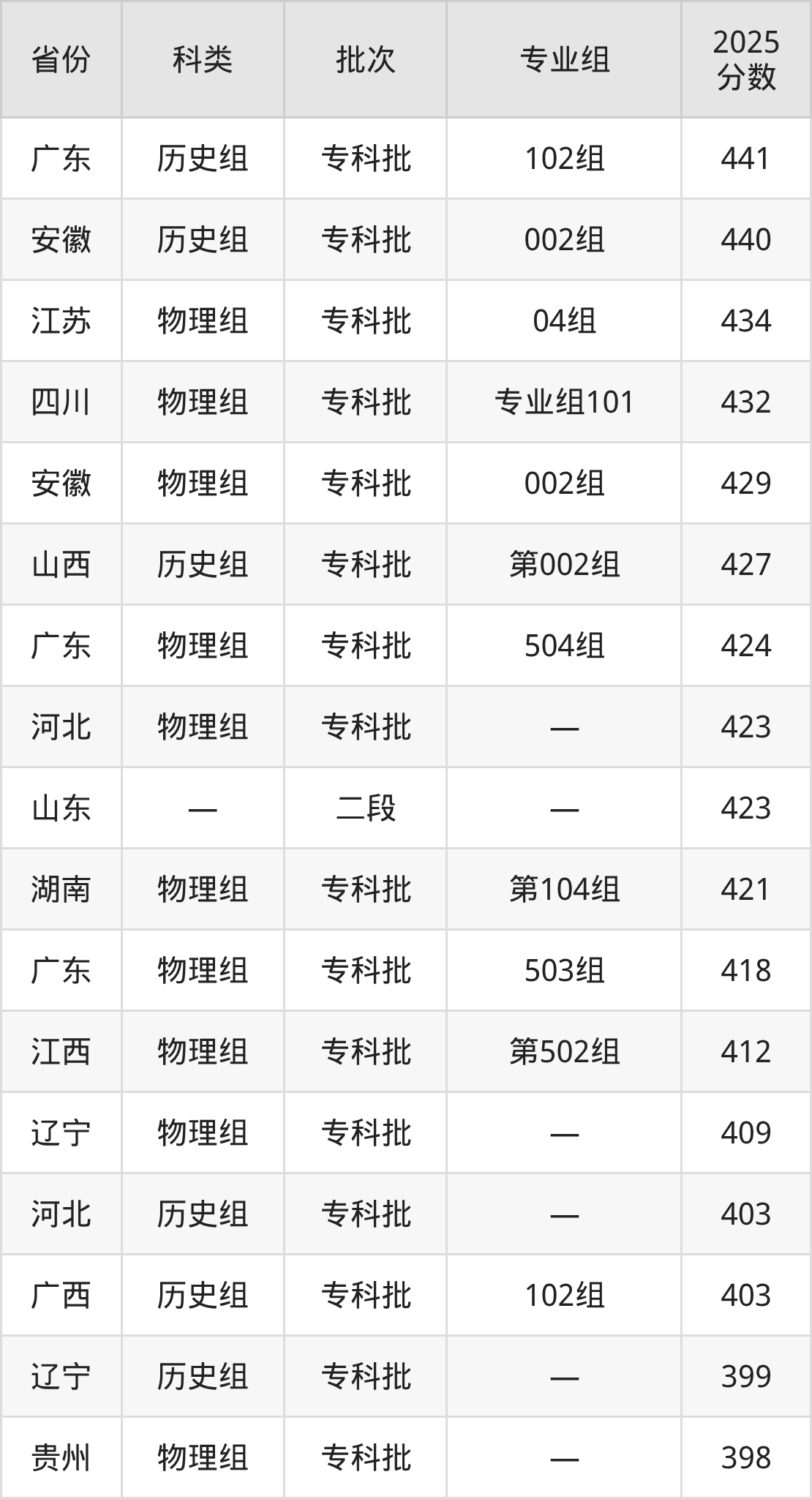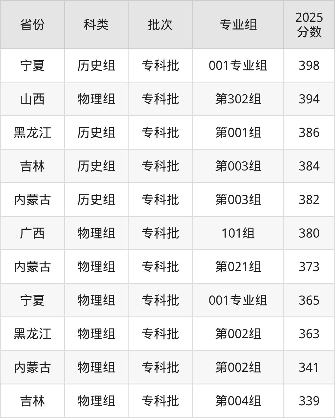 民政职业大学在市外招生的最低分为339分,其中吉林地区物理组考生上民政职业大学的分数门槛最低,考生成绩超专科线179分(339分)可上。其次是内蒙古物理组考生,上民政职业大学至少要超专科线181分(341分)。