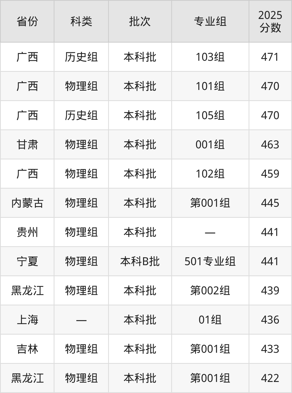 衢州学院在省外招生的最低分为422分,其中黑龙江地区物理组考生上衢州学院的分数门槛最低,考生成绩超本科线62分(422分)可上。其次是吉林物理组考生,上衢州学院至少要超本科线93分(433分)。