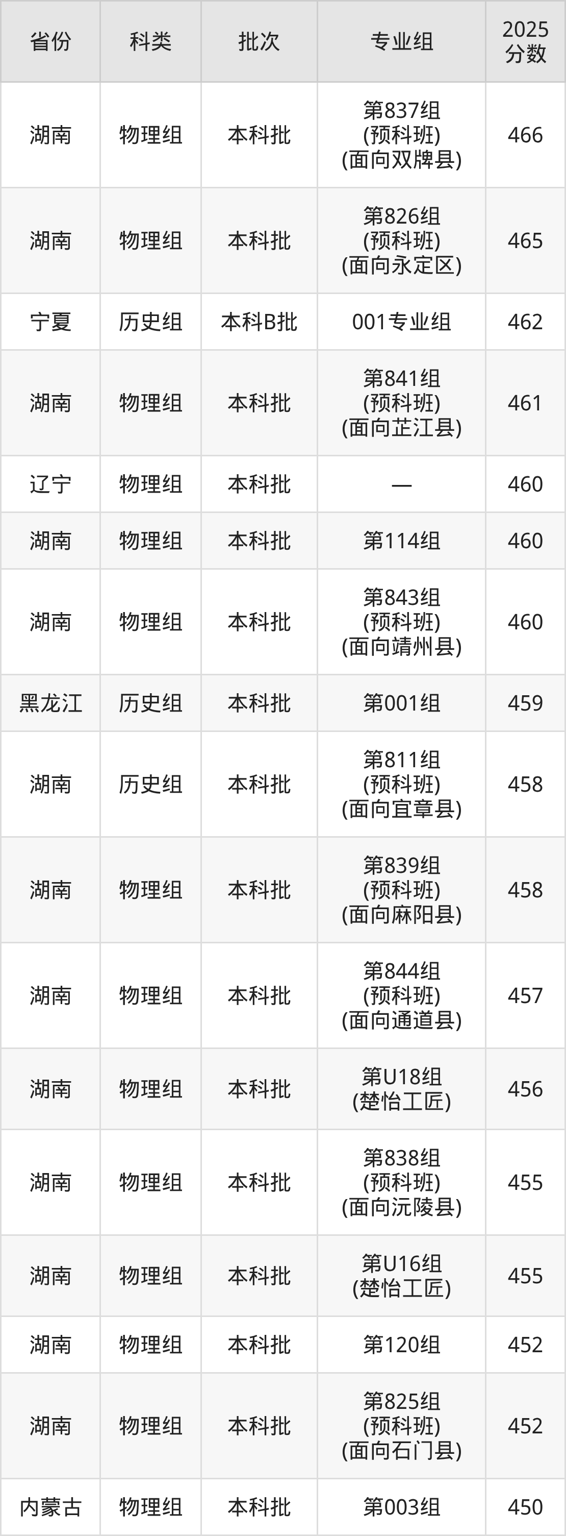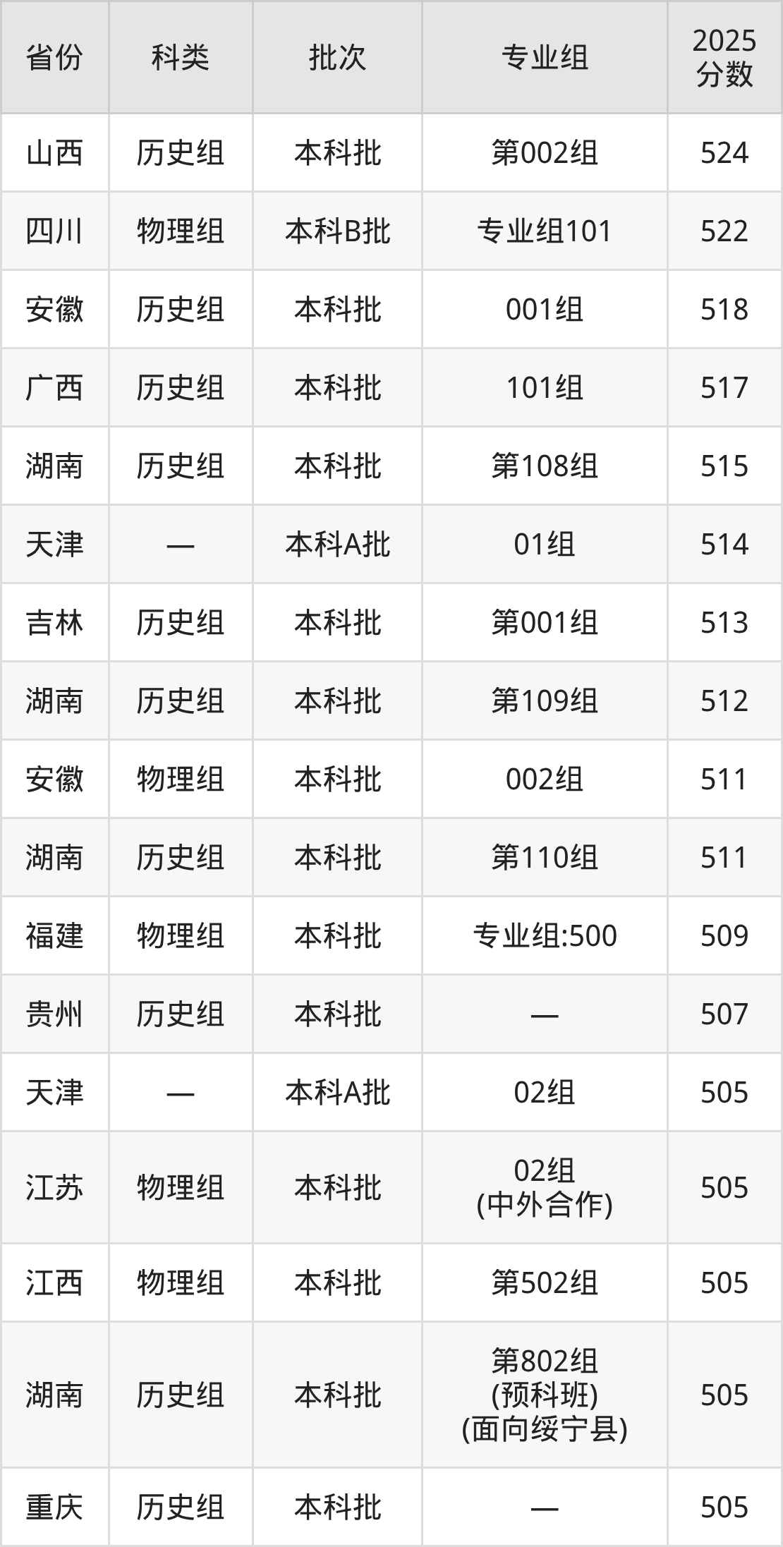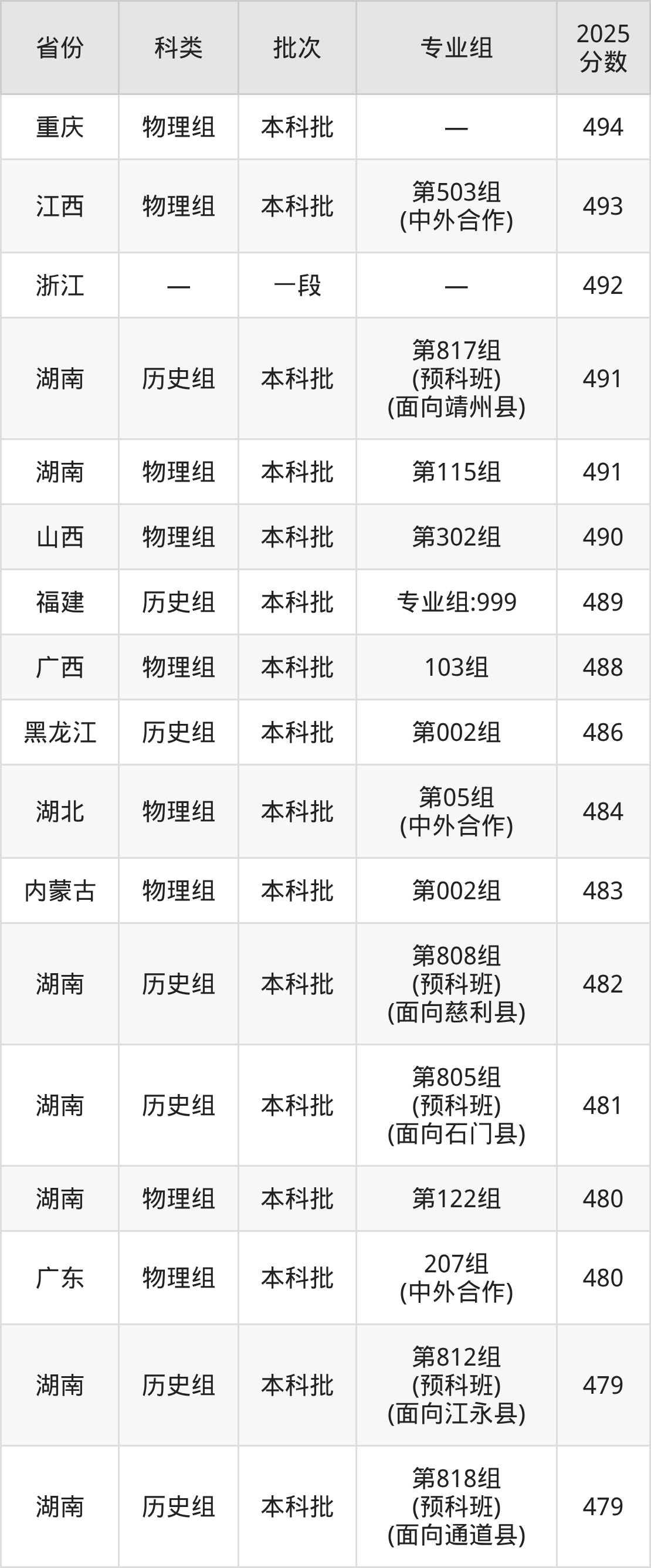 而海南地区考生的分数门槛最高,2025年湖南文理学院专业组04在海南招生最低分为595分,考生至少要超本科线115分才有可能被录取。