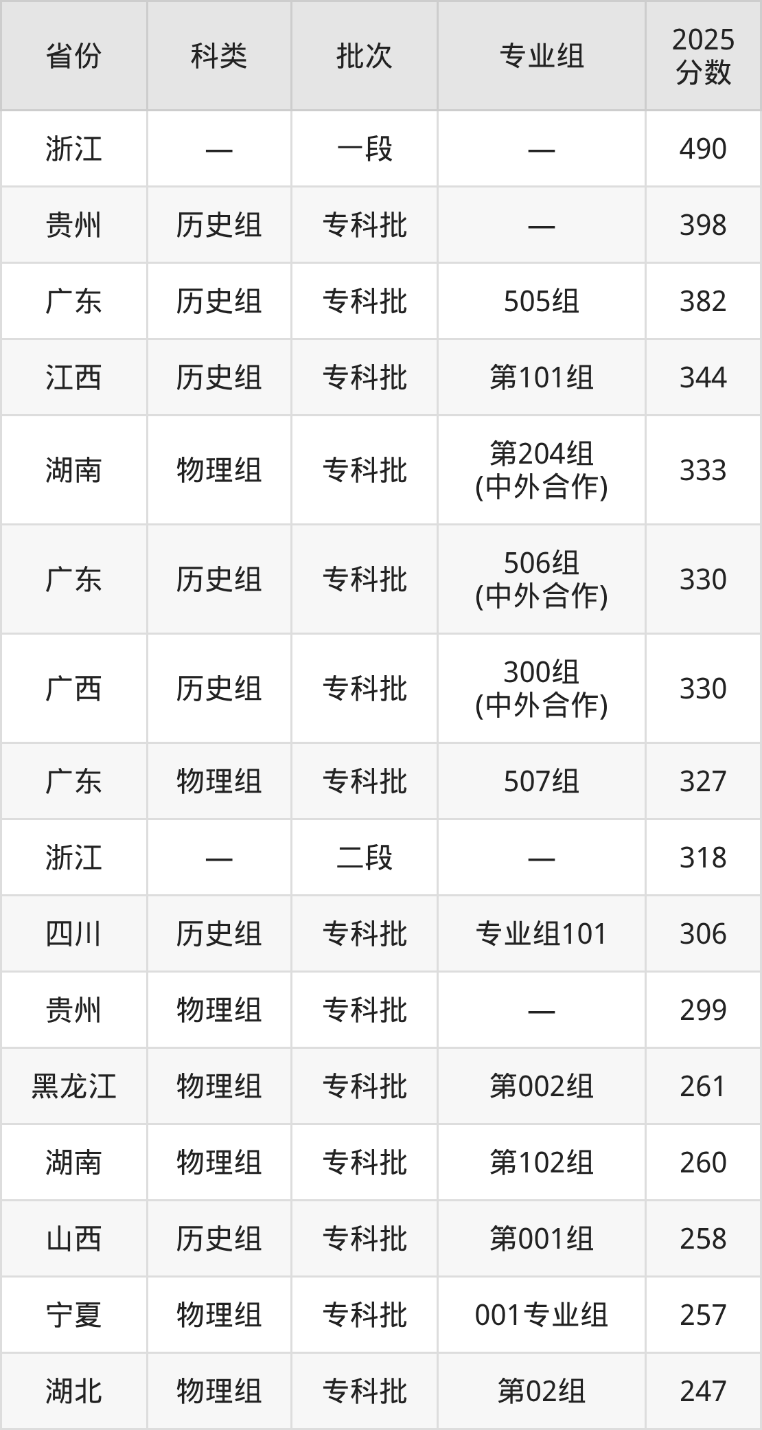 2025年江西工商职业技术学院在全国普通批次招生的录取分数范围位于150~490分之间,其中省内分数范围为240分~344分,历史组最低分专业组为“第101组”,考生344分即可报考,物理组最低分专业组为“第501组”,考生240分即可报考。
