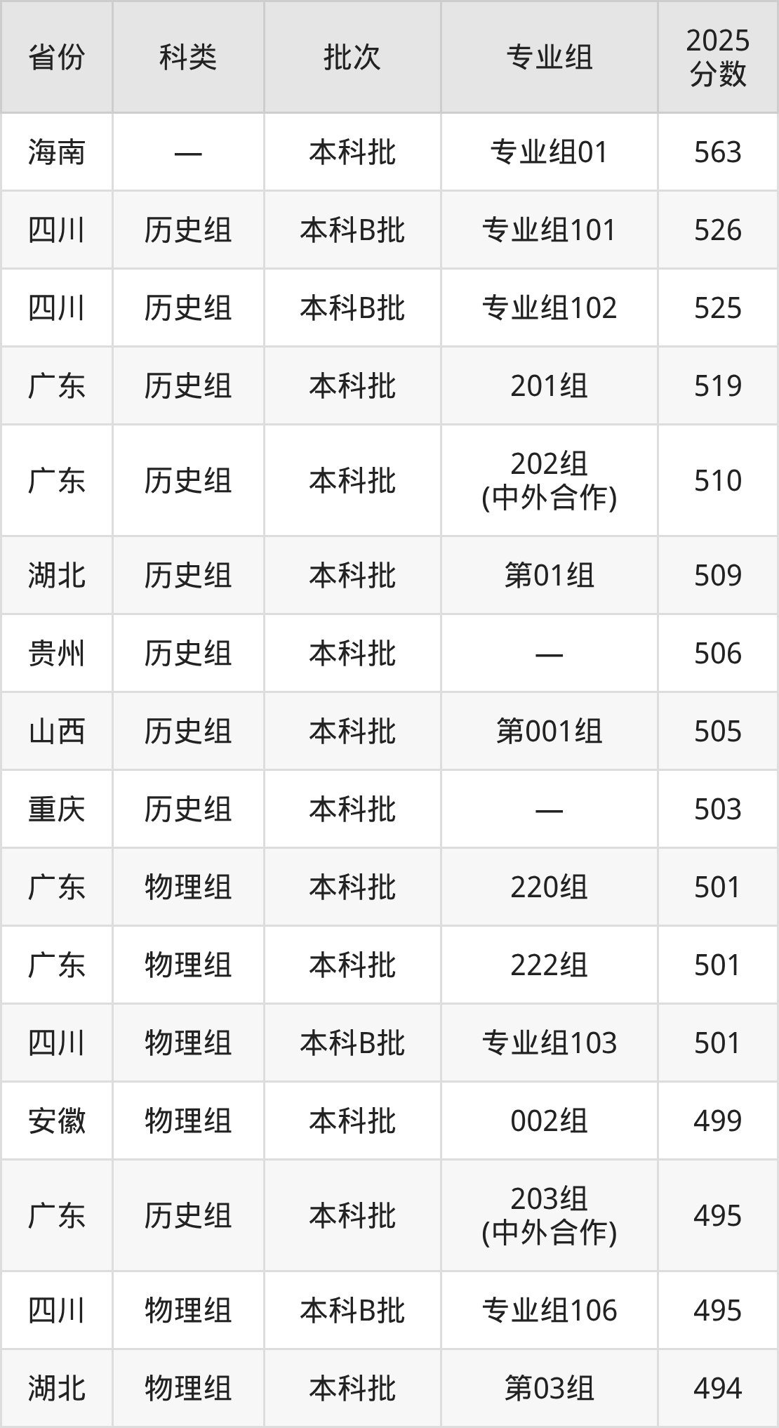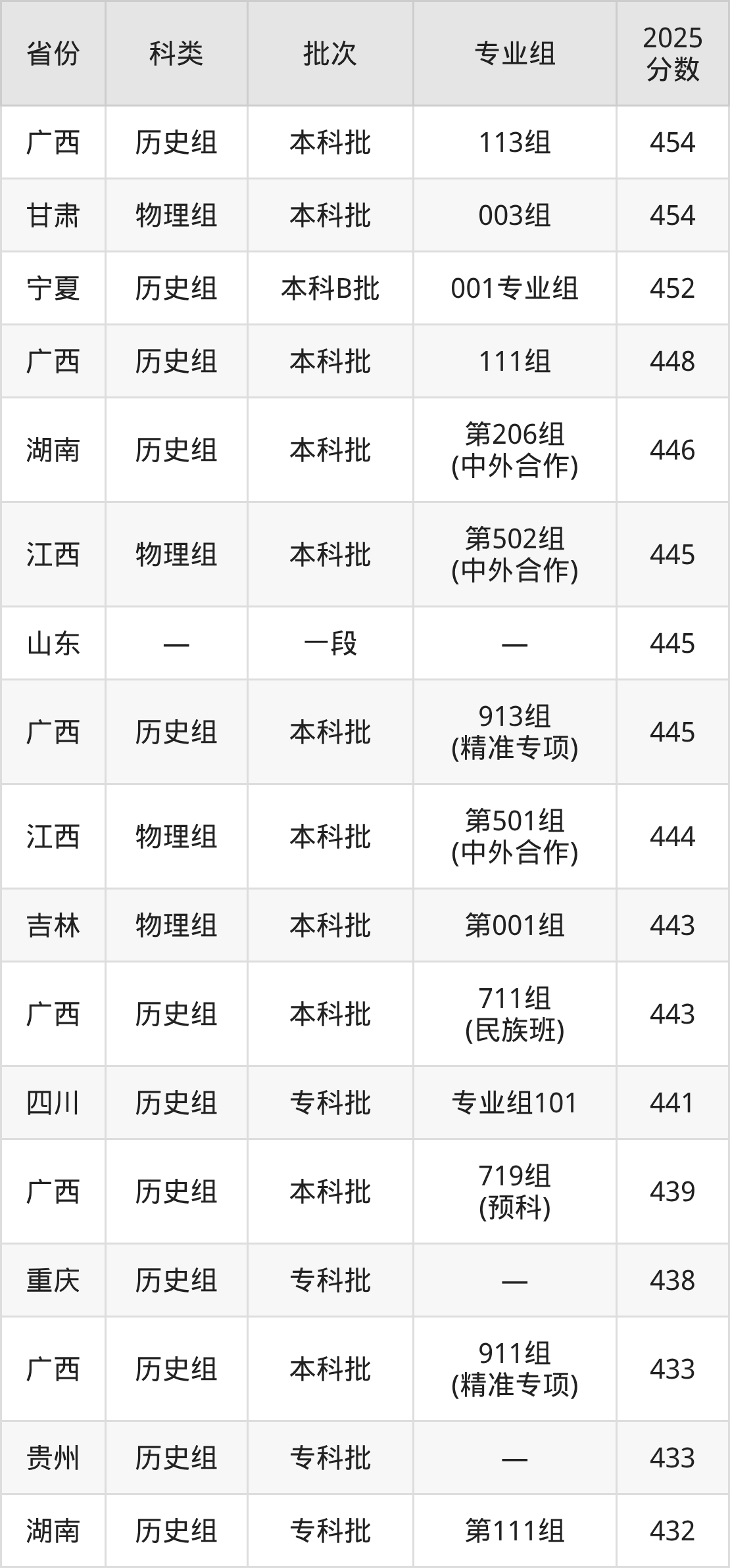 而海南地区考生的分数门槛最高,2025年桂林旅游学院专业组01在海南招生最低分为563分,考生至少要超本科线83分才有可能被录取。