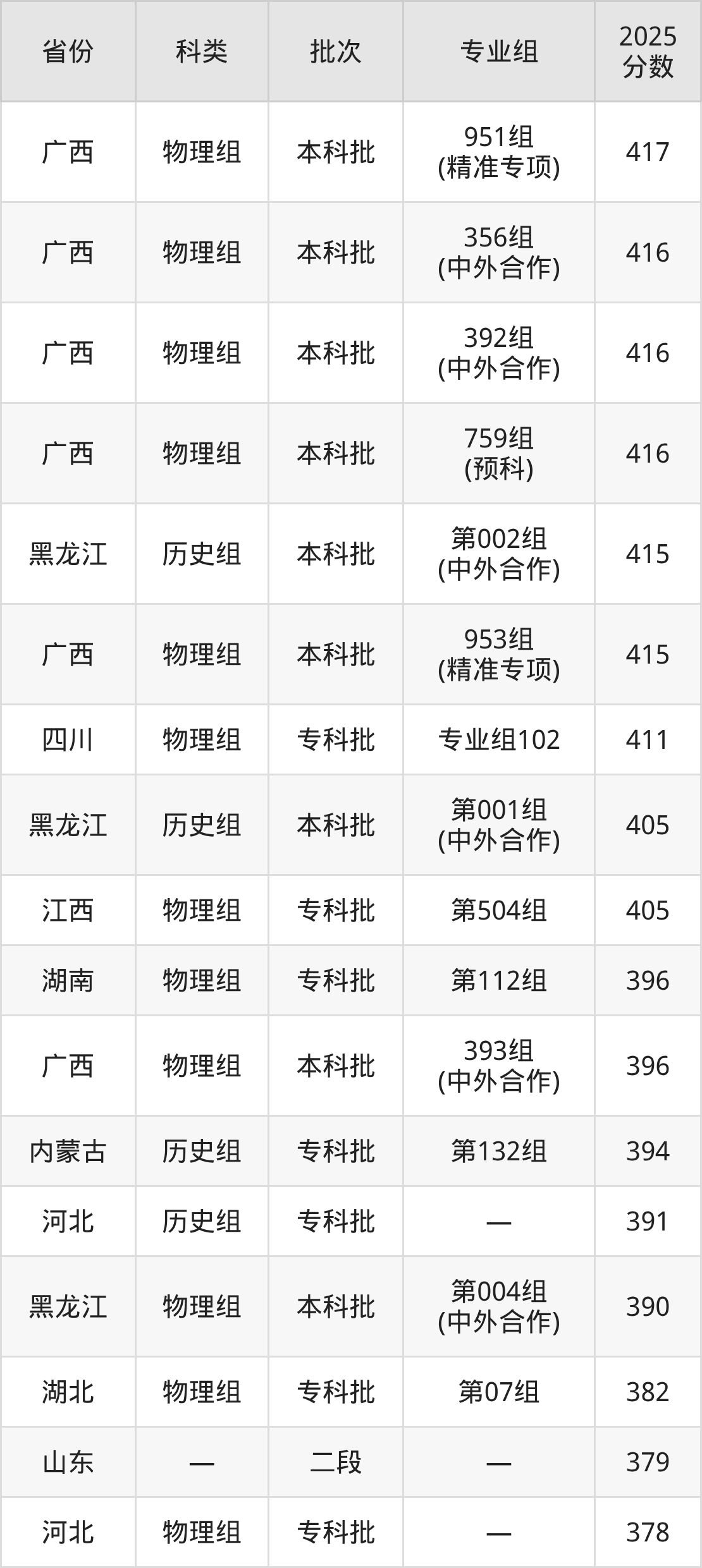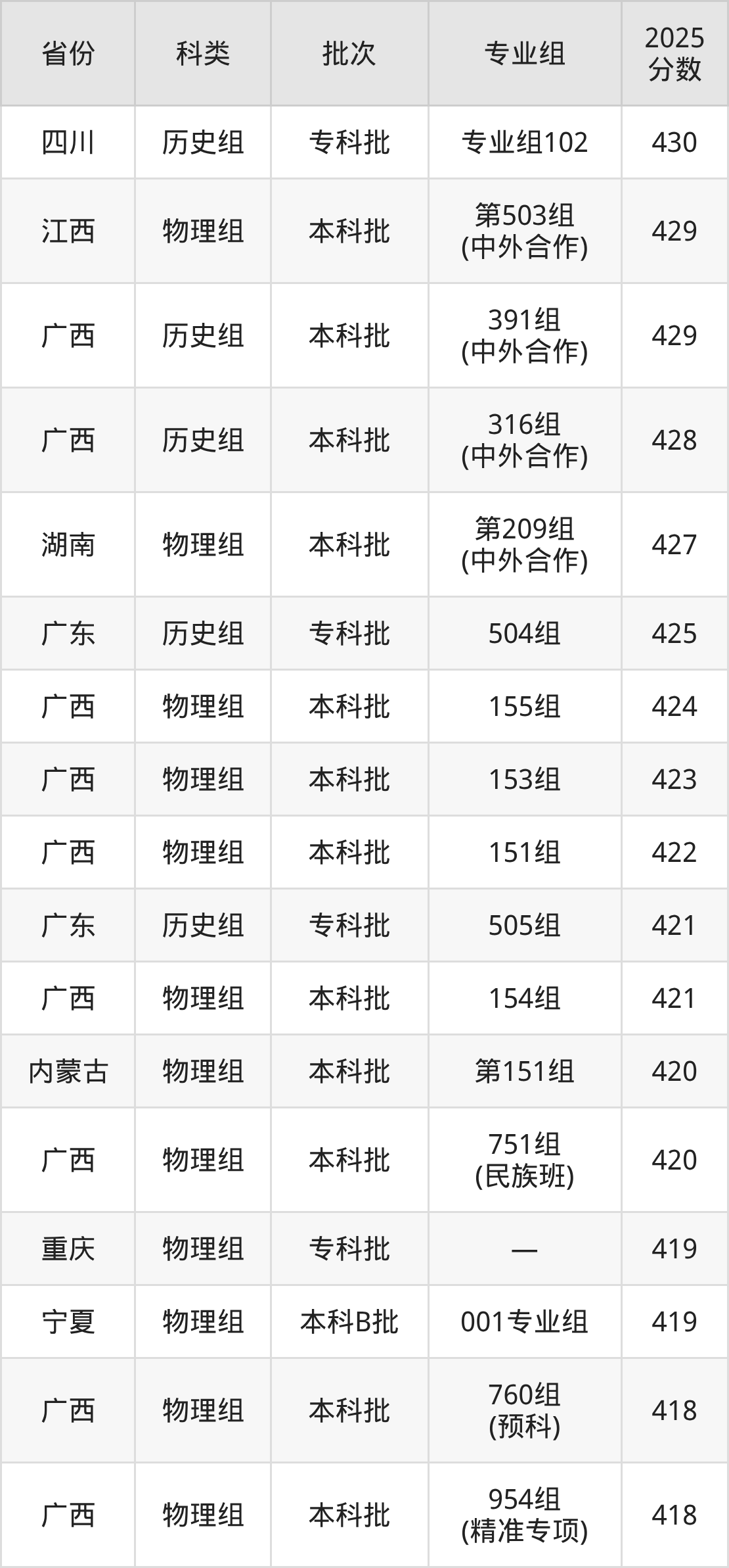 桂林旅游学院2026年录取分数需在高招结束官方数据公布后更新,2026届有意向报考该校的同学,可以在填报志愿时参考桂林旅游学院2025年录取分数线: