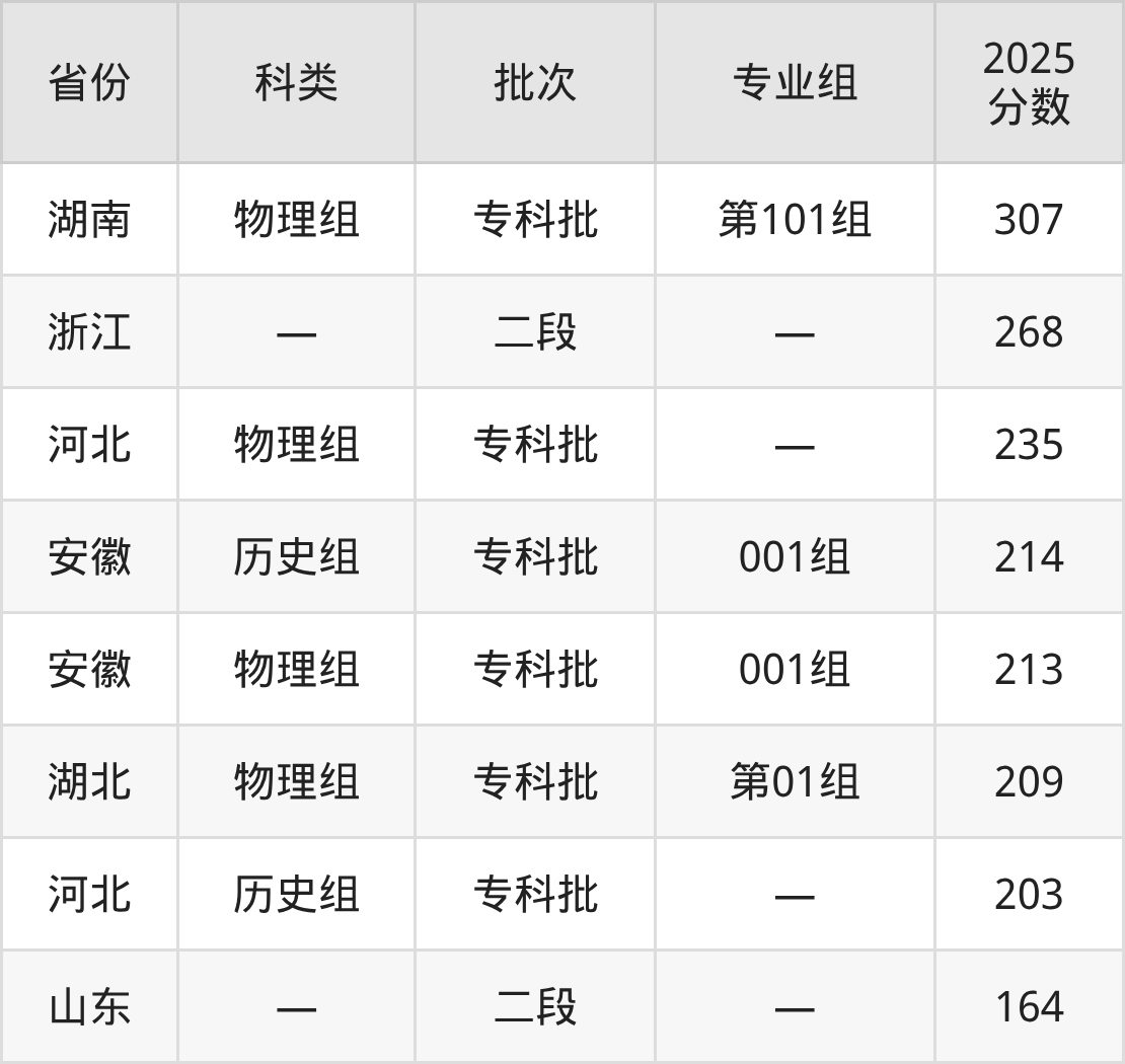 而湖南地区物理组考生的分数门槛最高,2025年信阳航空职业学院第101组在湖南招生最低分为307分,考生至少要超专科线107分才有可能被录取。