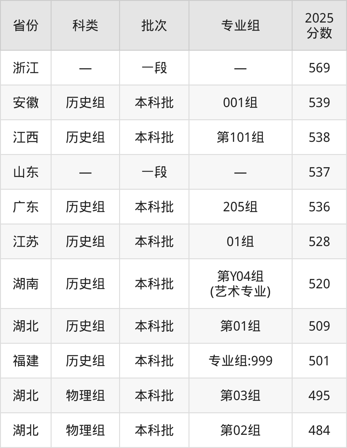 而浙江地区考生的分数门槛最高,2025年湖北美术学院在浙江招生最低分为569分,考生至少要超一段线79分才有可能被录取。