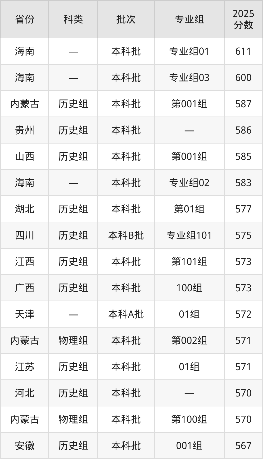 而海南地区考生的分数门槛最高,2025年河南财经政法大学专业组01在海南招生最低分为611分,考生至少要超本科线131分才有可能被录取。