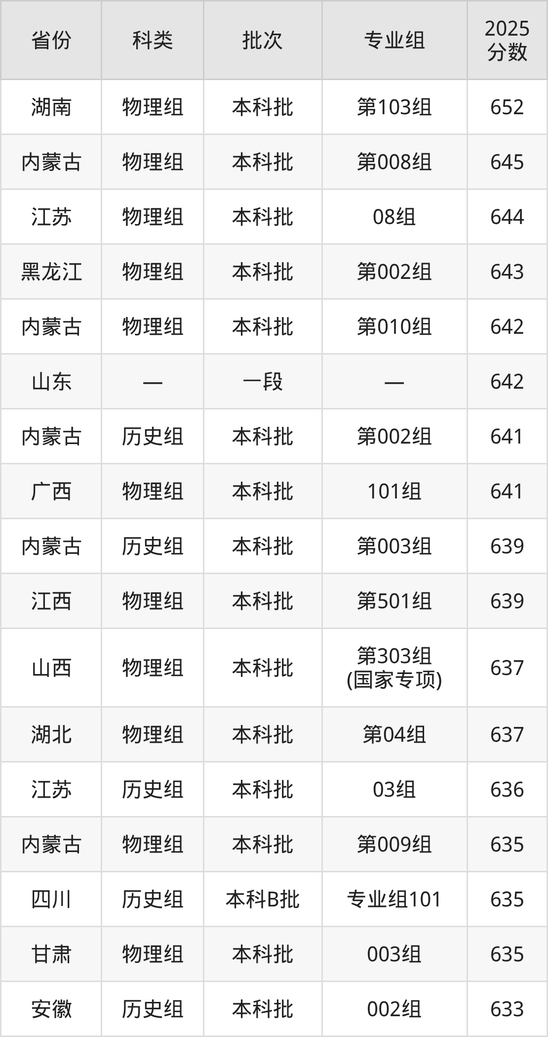 2025年东南大学在全国普通批次招生的录取分数范围位于562~757分之间,其中省内分数范围为636分~657分,物理组最低分专业组为“08组”,考生644分即可报考,历史组最低分专业组为“03组”,考生636分即可报考。