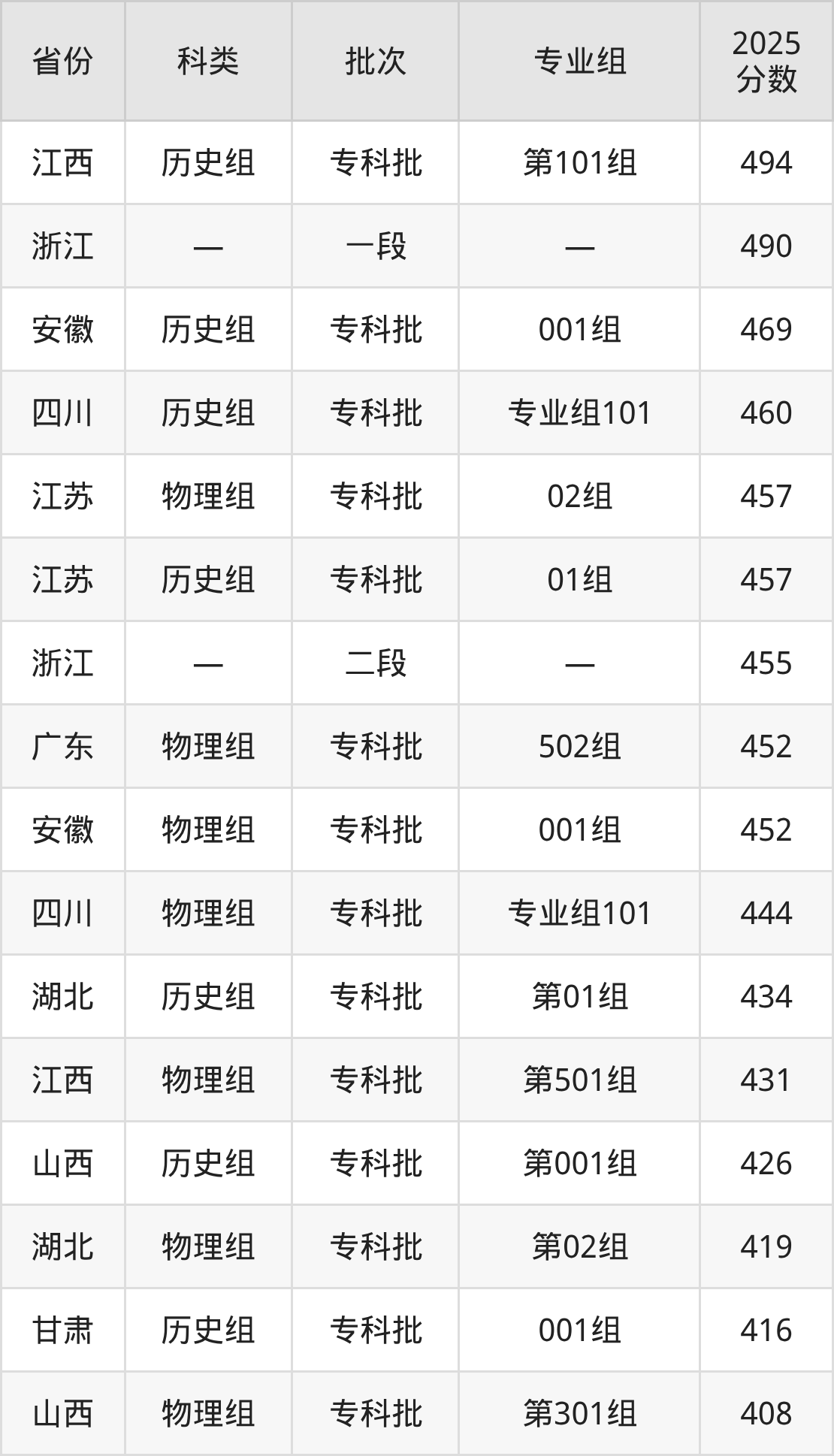 而江西地区历史组考生的分数门槛最高,2025年浙江邮电职业技术学院第101组在江西招生最低分为494分,考生至少要超专科线204分才有可能被录取。